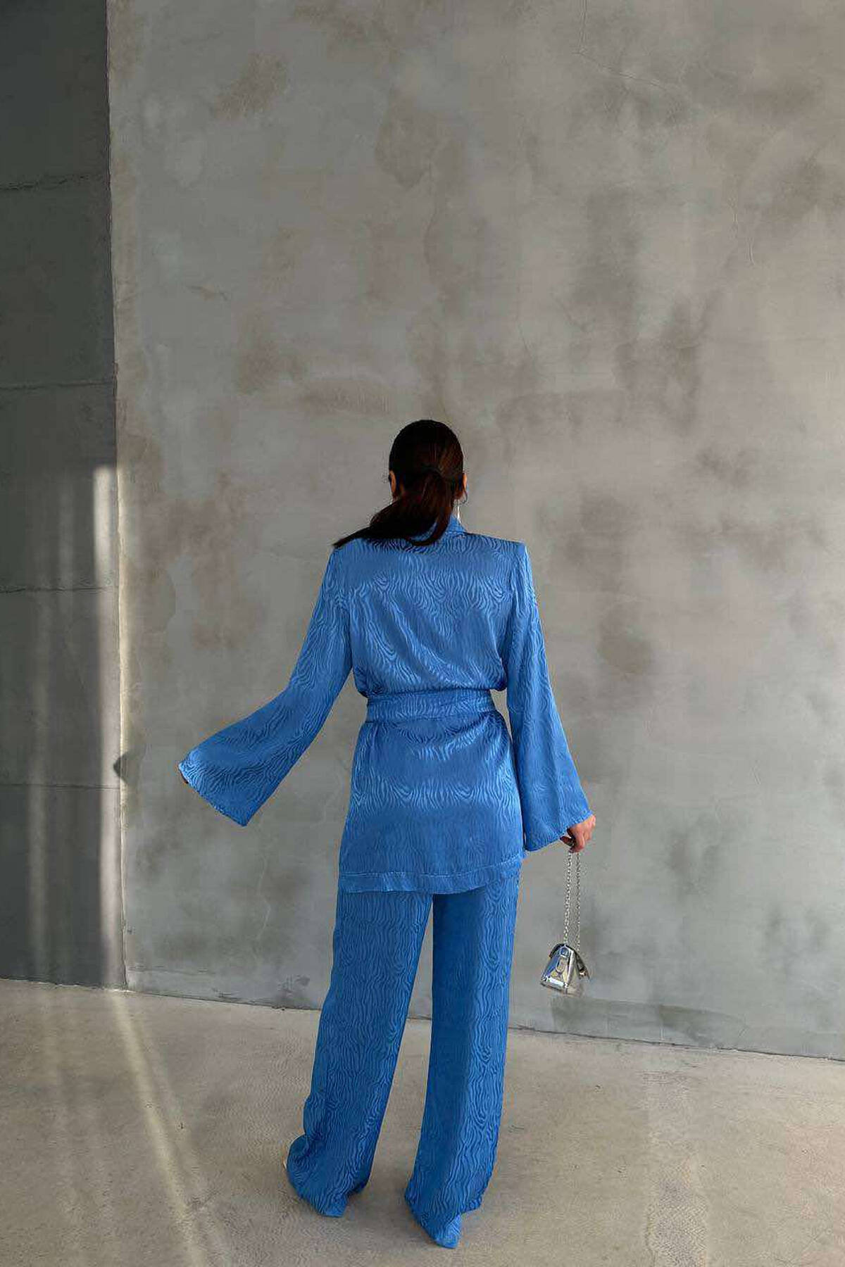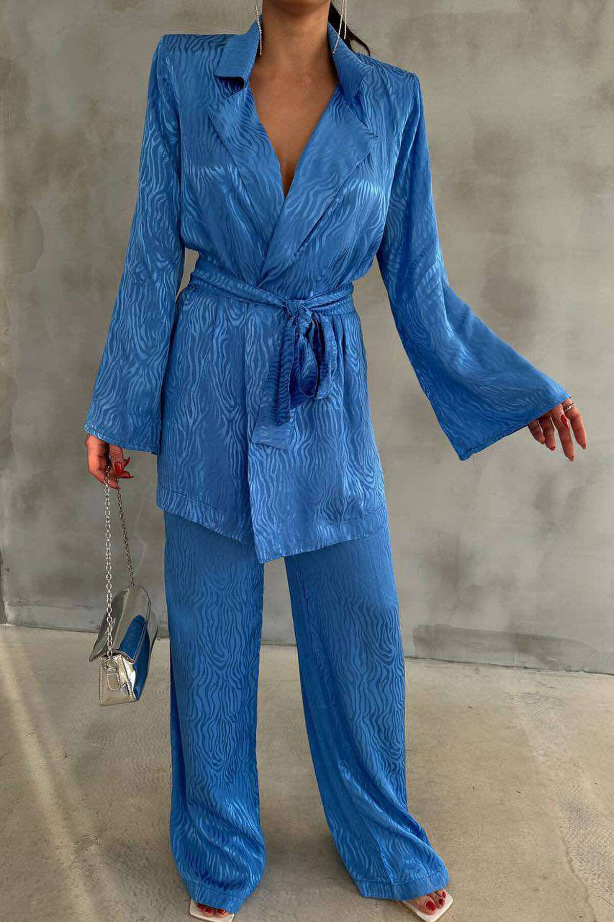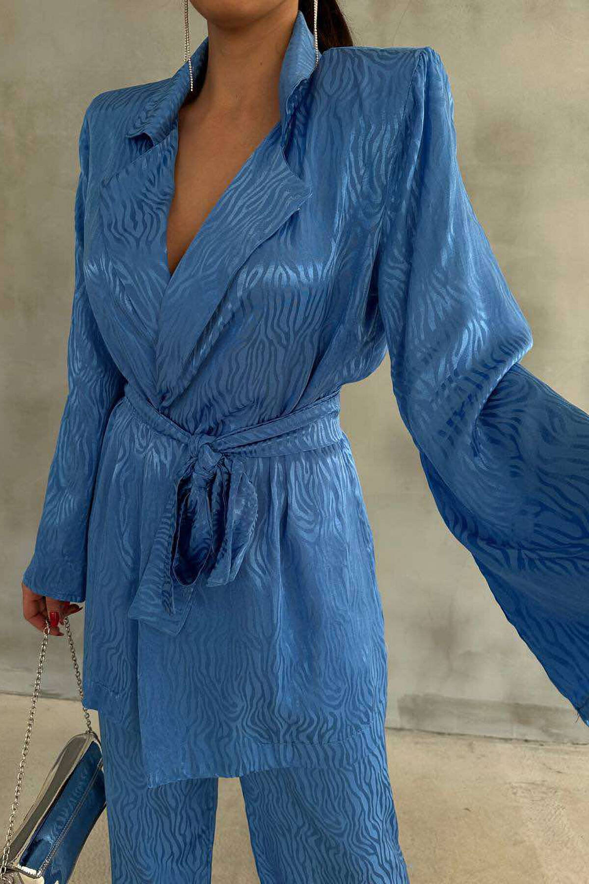 SET NJË NGJYRËSH ME DETAJIN E LIDHSEVE XHAKETË+PANTALLONA PËR FEMRA NË NGJYRËN BLU