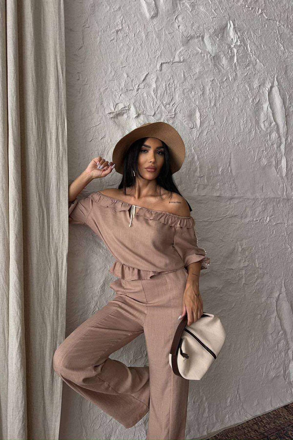 SET NJË NGJYRËSH BLUZË+PANTALLONA PËR FEMRA NË NGJYRË BEZHË