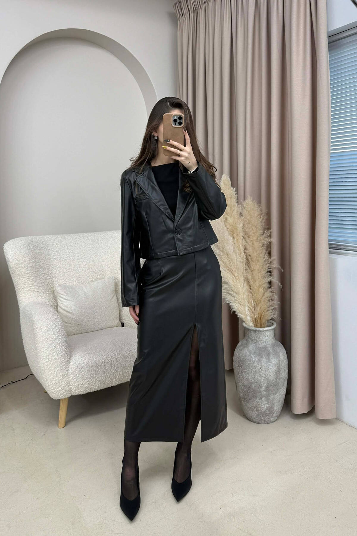 ONE COLOR CROPPED JACKET+SKIRT WOMEN SET BLACK/ E ZEZE