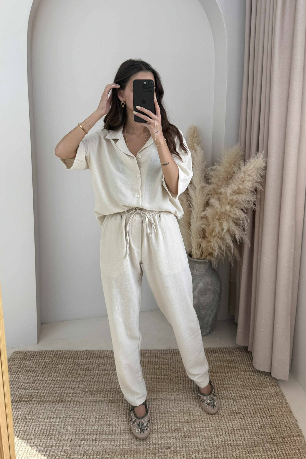 SET NJËNGJYRËSH KËMISHË ME MËNGË TË SHKURTRA+PANTALLONA PËR FEMRA NË NGJYRËN BEZHË TË ZBARDHUR
