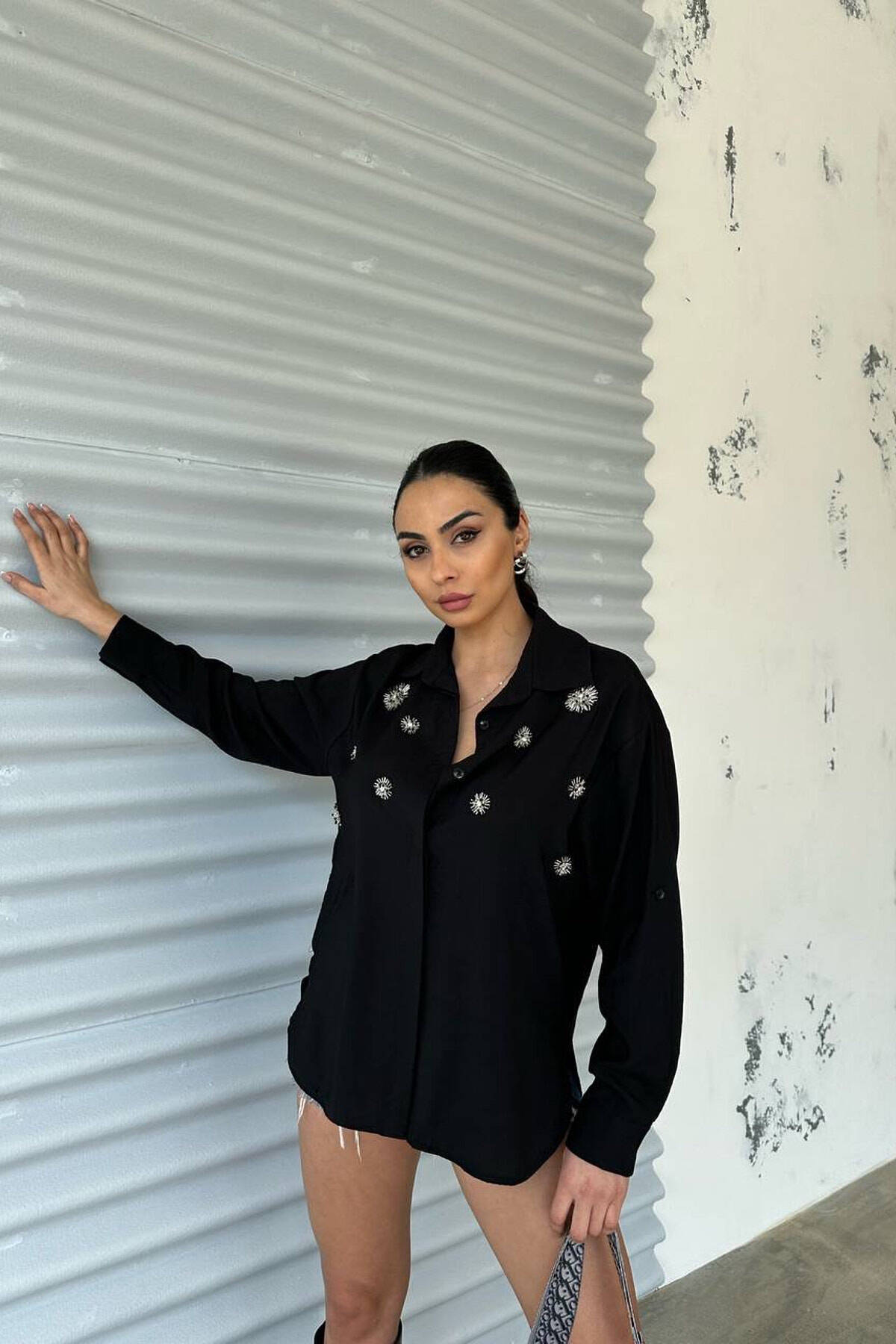 SHINNY FLOWER DETAILS ONE COLOR WOMEN SHIRT BLACK/ E ZEZE