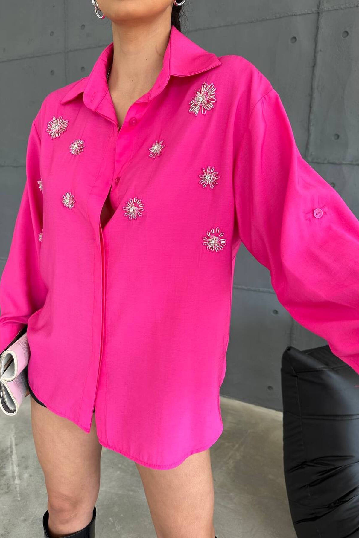 SHINNY FLOWER DETAILS ONE COLOR WOMEN SHIRT FUCHSIA/CIKLAMI