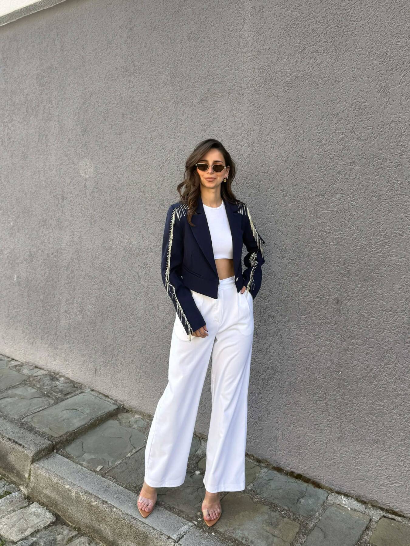 SHINY STONES DETAIL CROPPED WOMEN JACKET DARK BLUE/BEE
