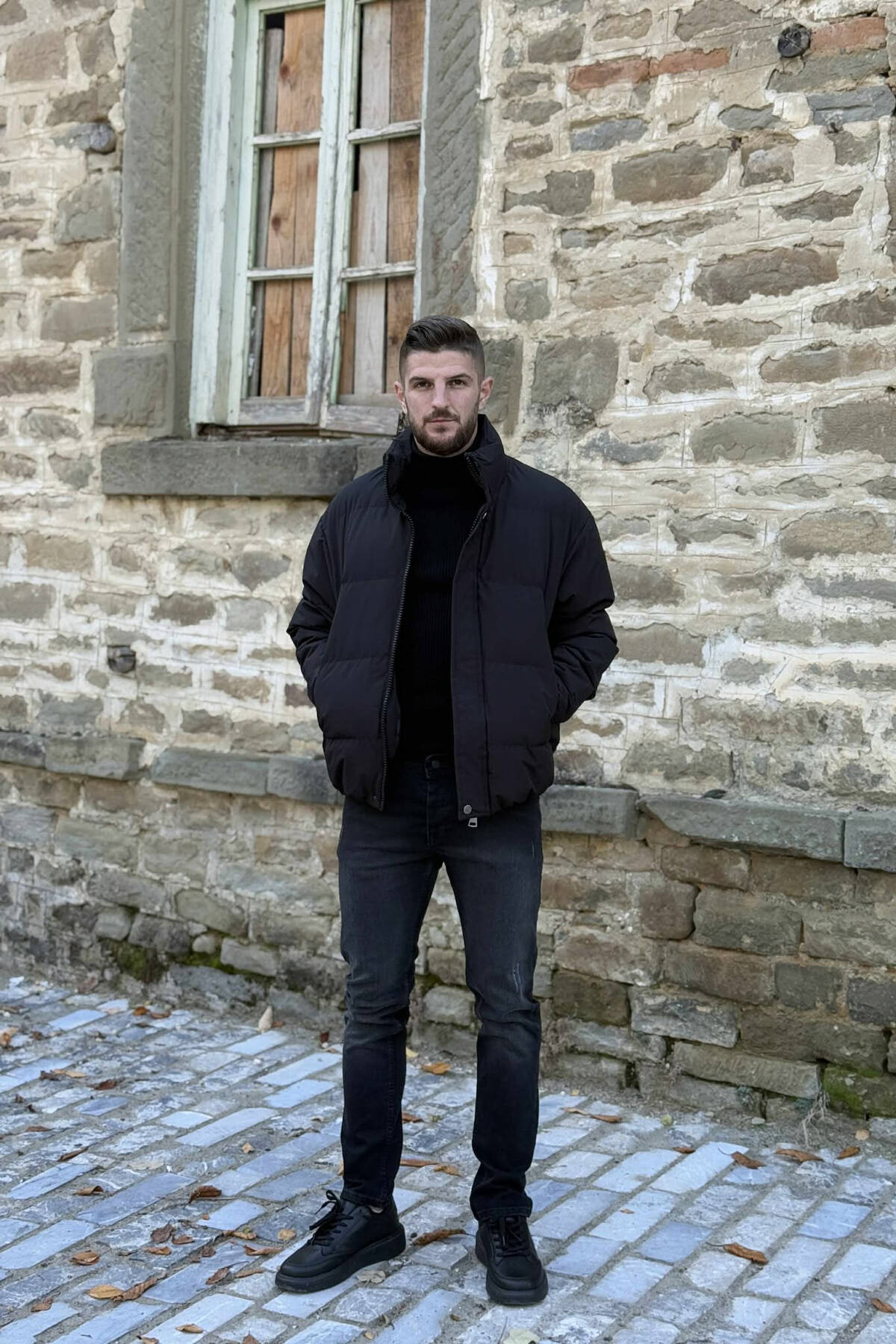 NECK AND BOTTOM BELTED FLUFFY MEN PUFFER JACKET BLACK/ E ZEZE