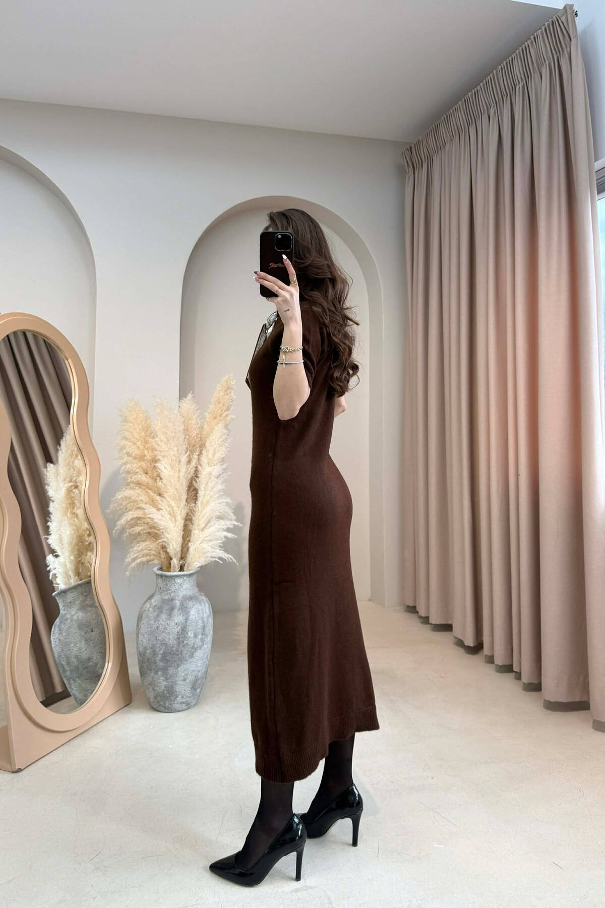 SHORT SLEEVE ONE COLOR LONG WOMEN DRESS BROWN/KAFE