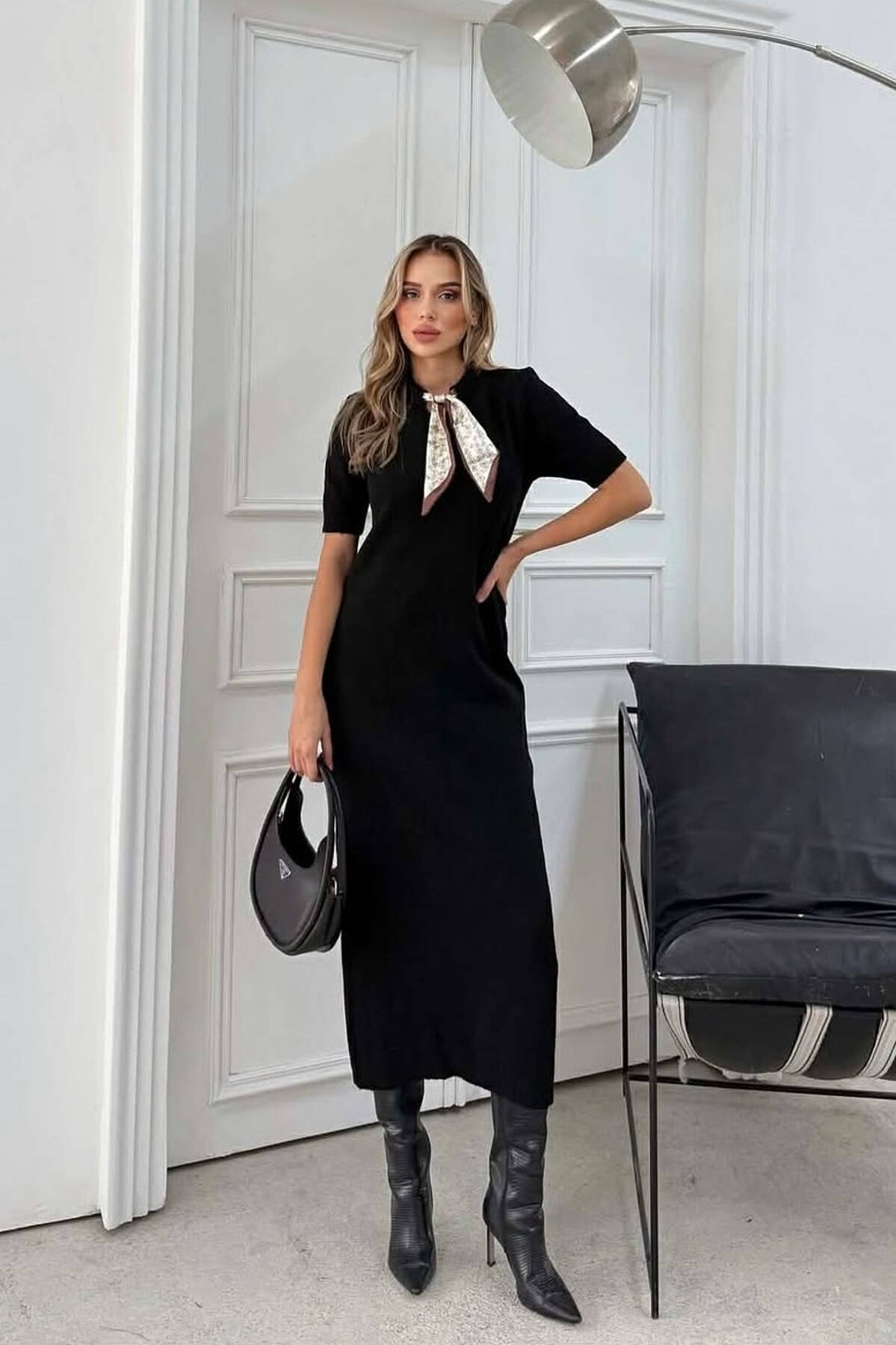 SHORT SLEEVES SCARF DETAIL KNIT WOMEN DRESS BLACK/ E ZEZE
