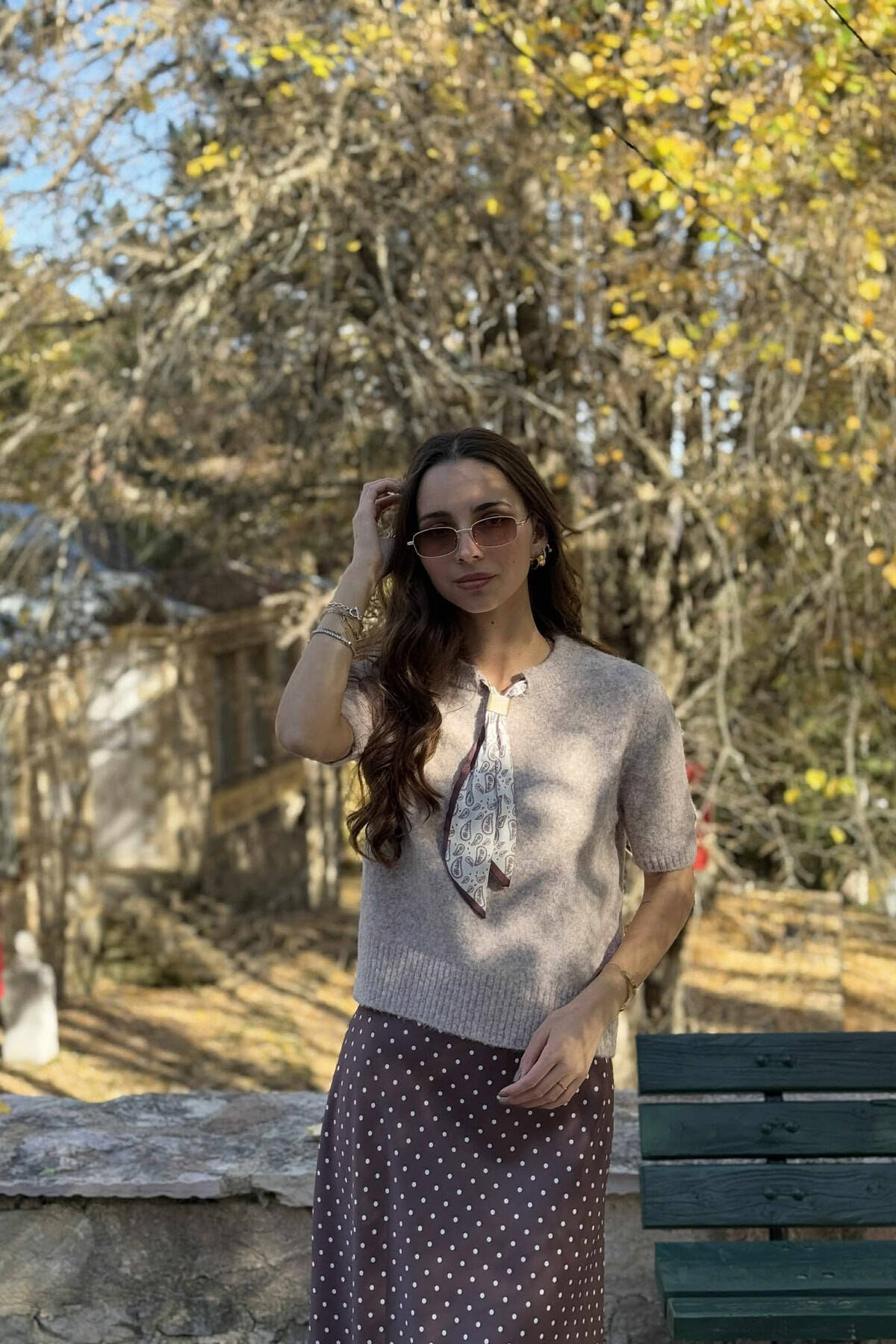 SHORT SLEEVES SCARF DETAIL WOMEN SWEATER BEIGE/BEZHE