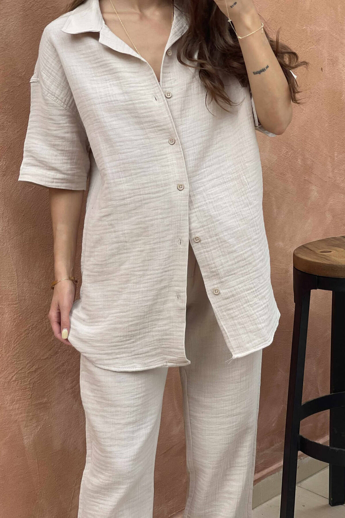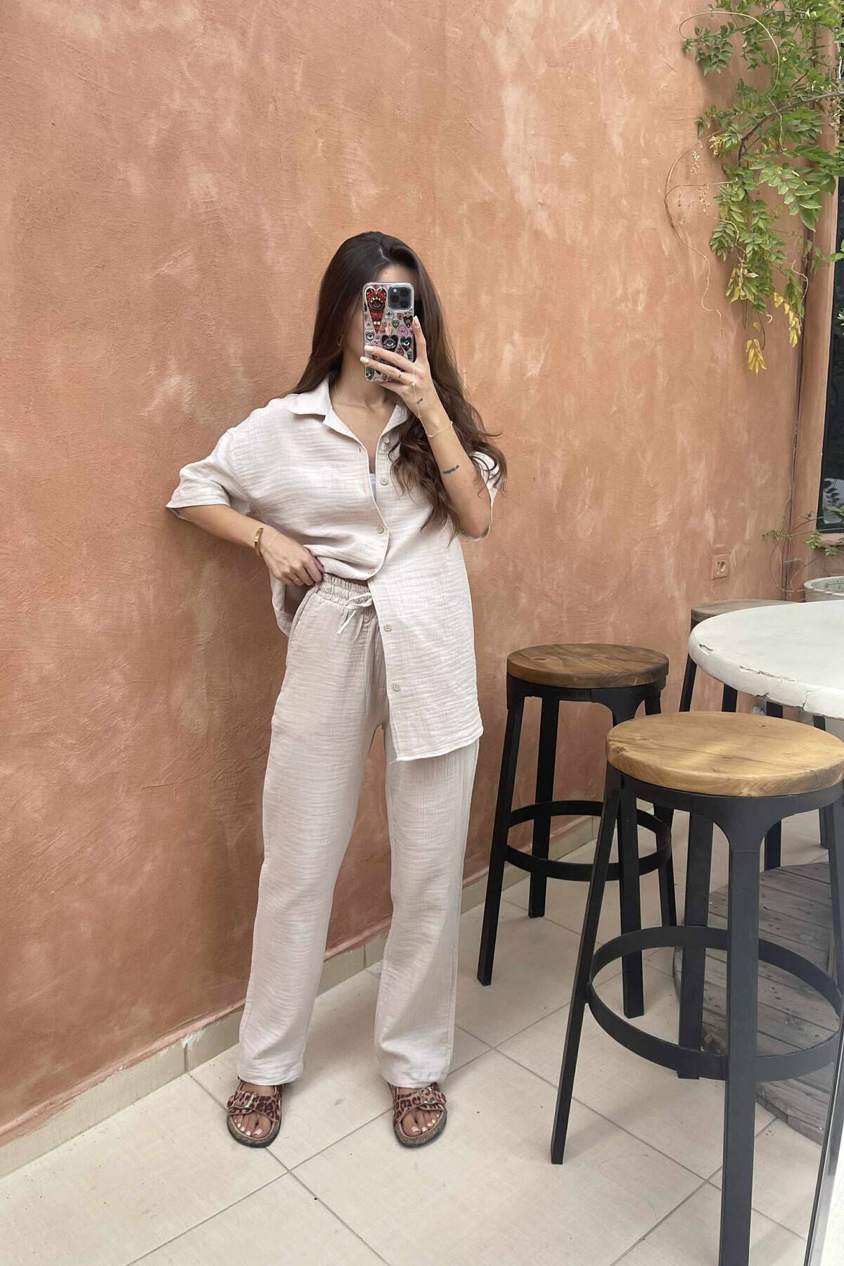SHORT SLEEVES SHIRT+TROUSERS SIMPLE WOMEN SET LIGHT BEIGE/BZHZB