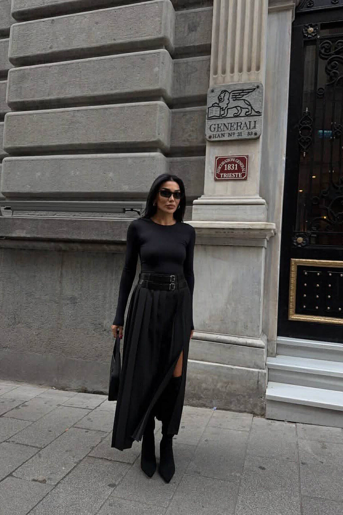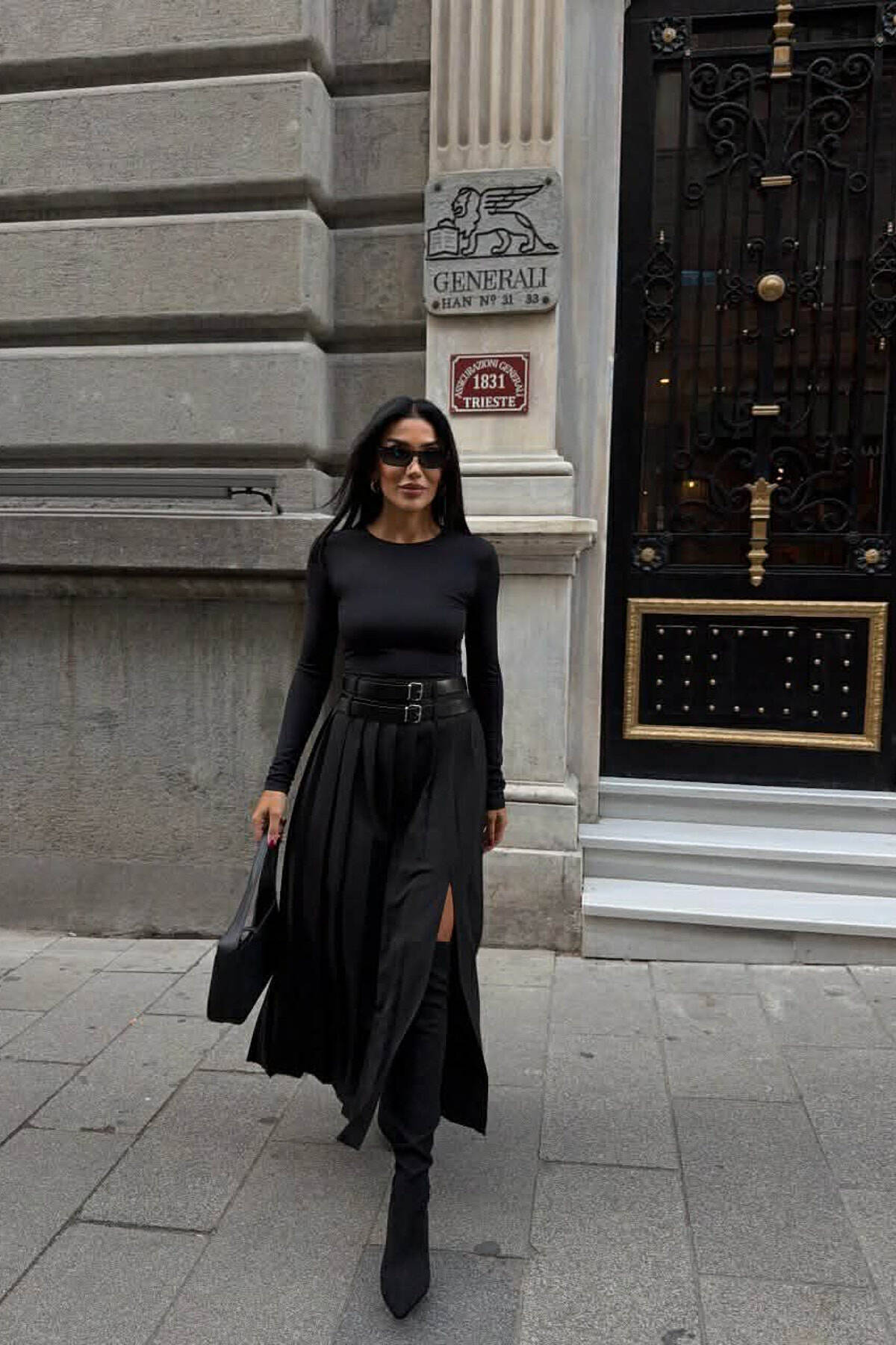 SIDE SPLIT LONG BELTED WOMEN SKIRT BLACK/ E ZEZE