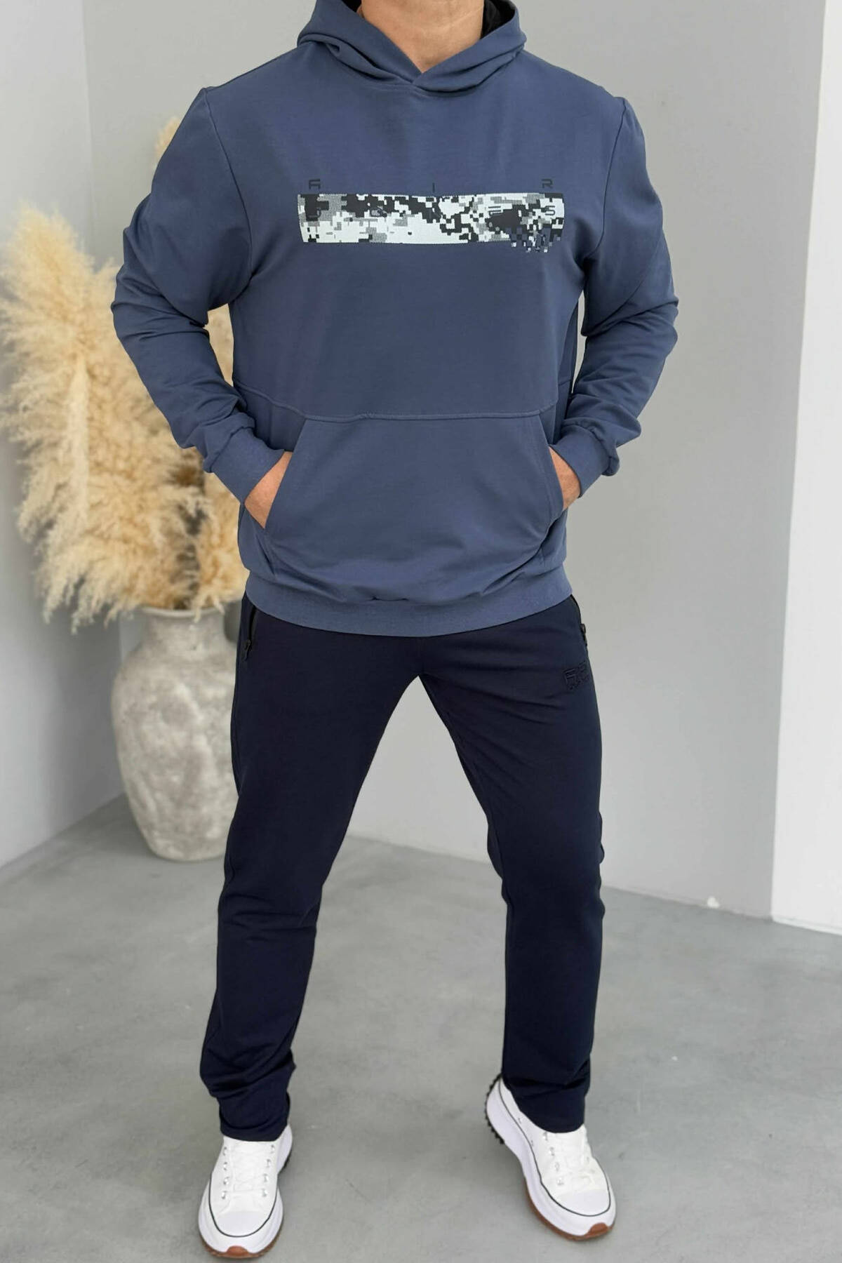 HOODIE NJËNGJYRËSHE ME SHKRIME PARA PËR MESHKUJ NË NGJYRËN BLU TË ERRËT