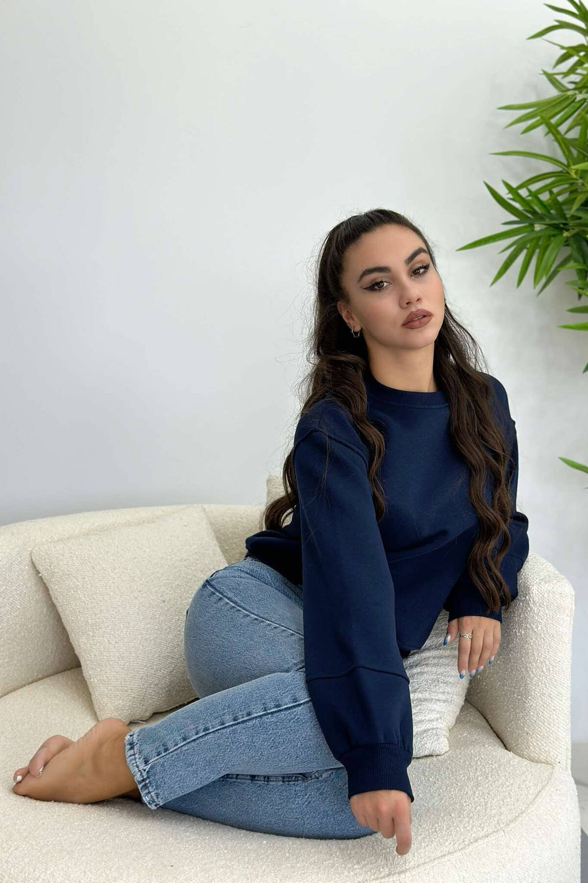 SIMPLE FLUFFY ONE COLOR COTTON WOMAN SWEATSHIRT DARK BLUE/BEE