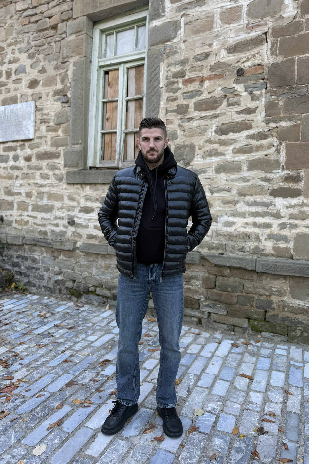 SIMPLE LEATHER PUFFER BELT-NECK MEN JACKET BLACK/ E ZEZE