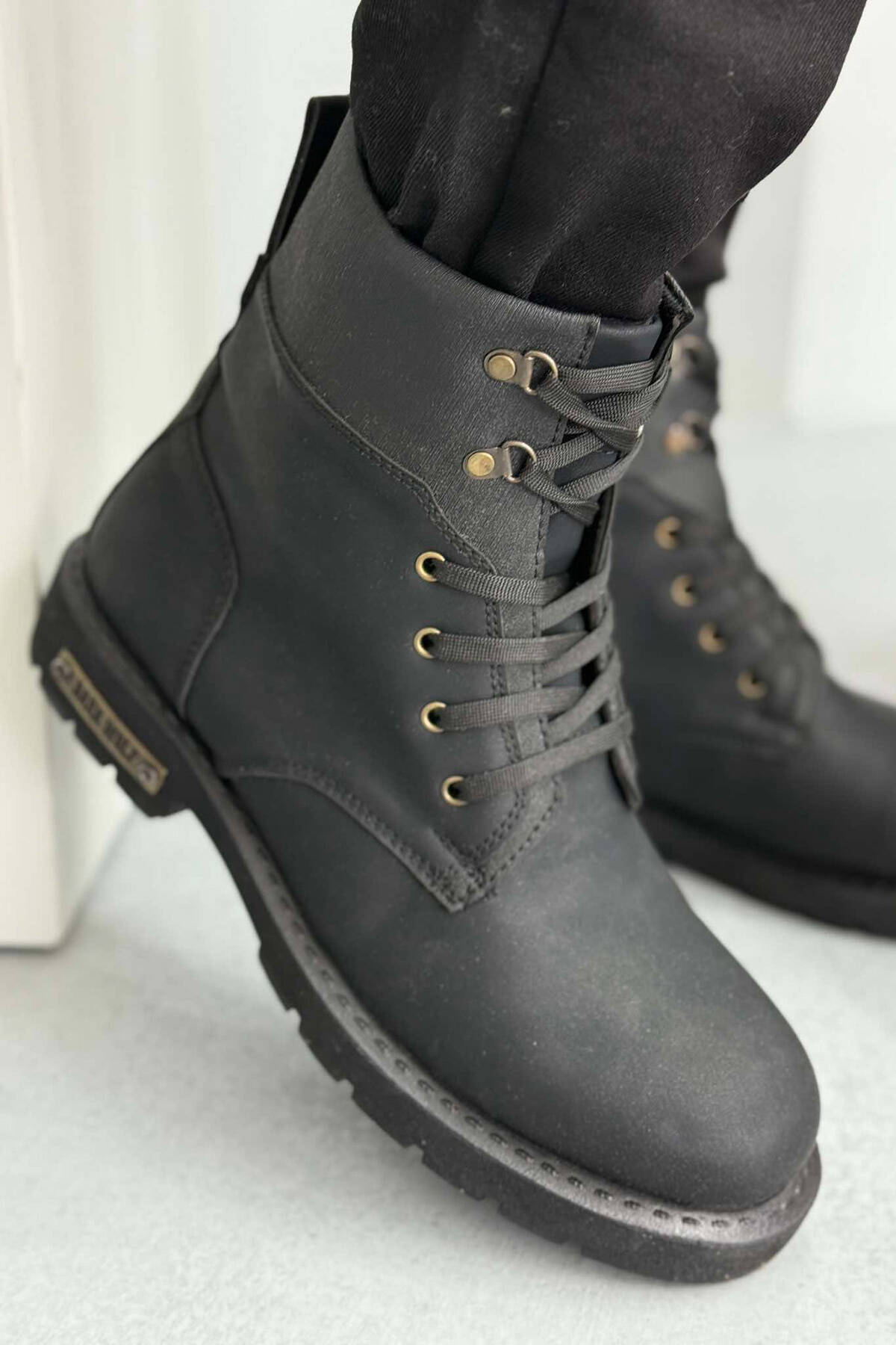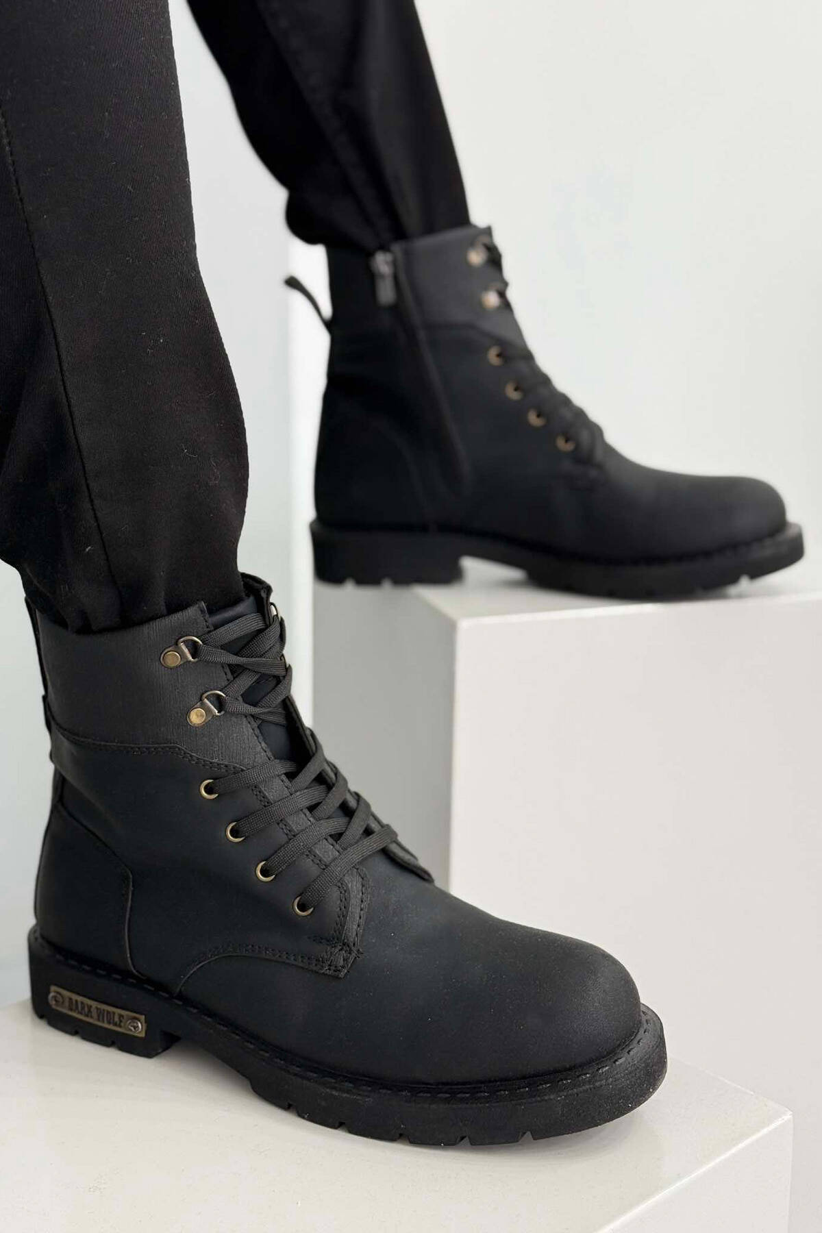 FLUFFY LACING LEATHER MEN ANKLE BOOTS BLACK/ E ZEZE