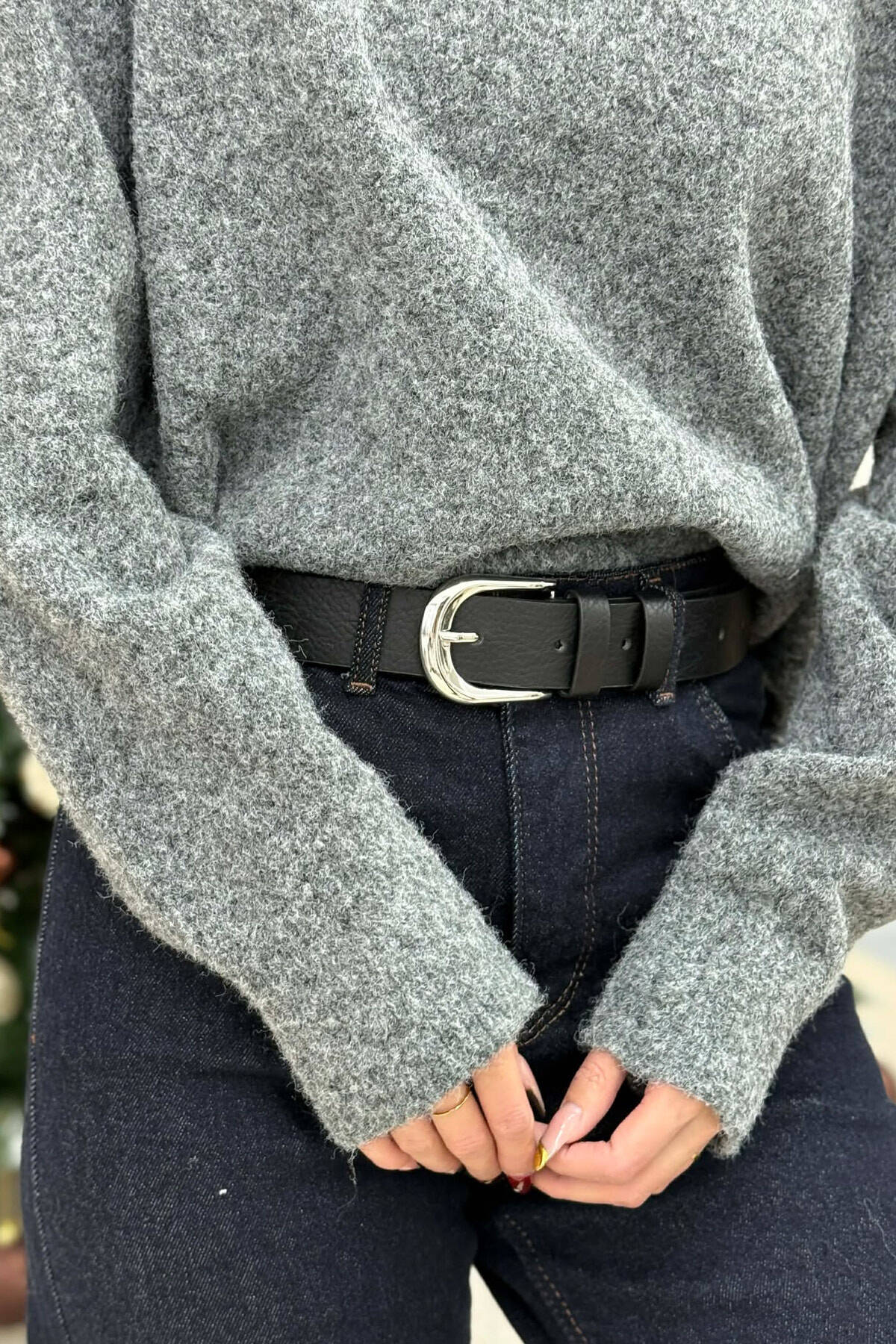 SIMPLE BUCKLE LEATHER WOMEN BELT BLACK+SILVER/ZEZE+ARGJEND