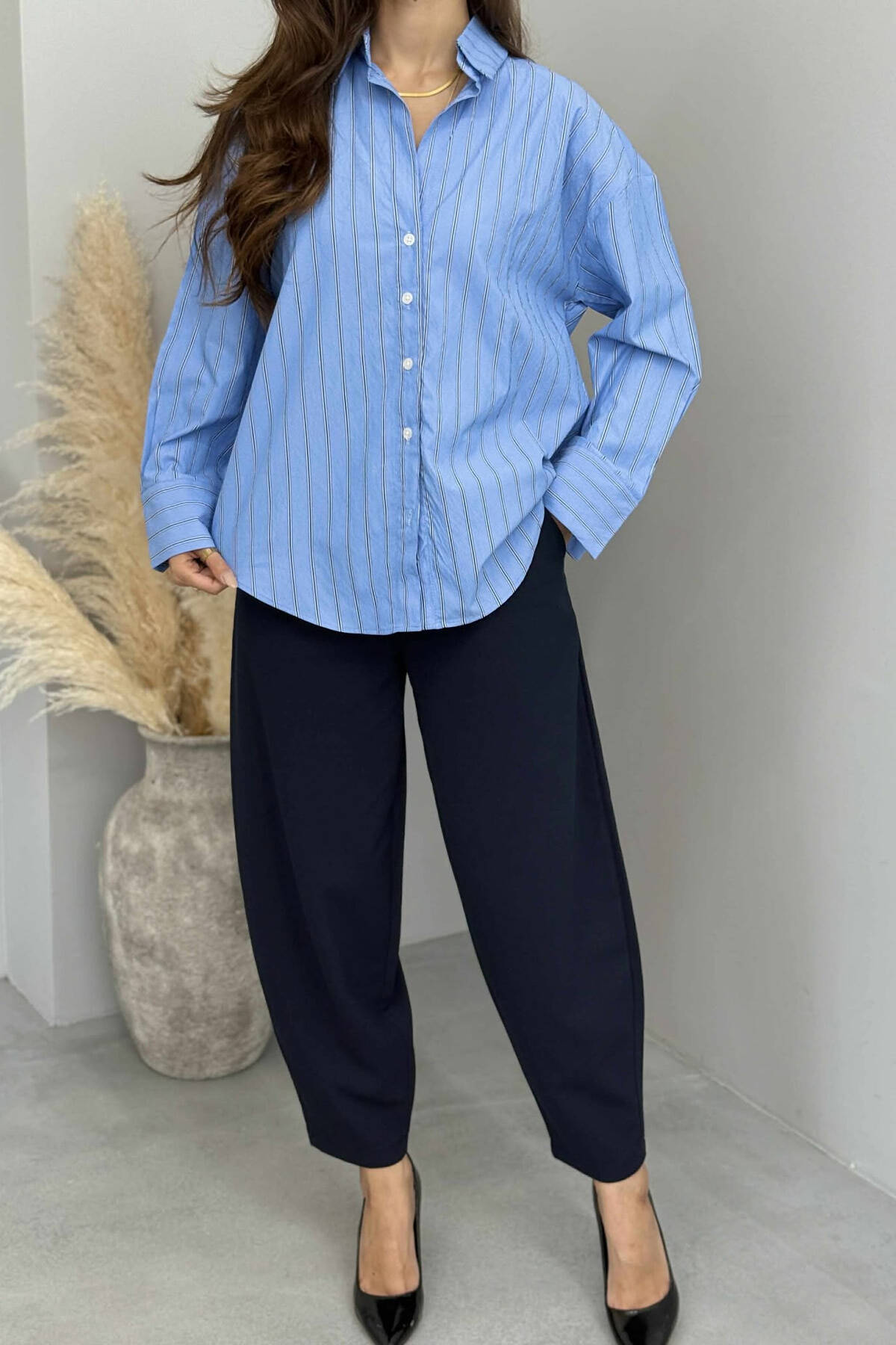 SIMPLE STRIPE DESIGN LONE SLEEVE WOMEN SHIRT BLUE/BLU