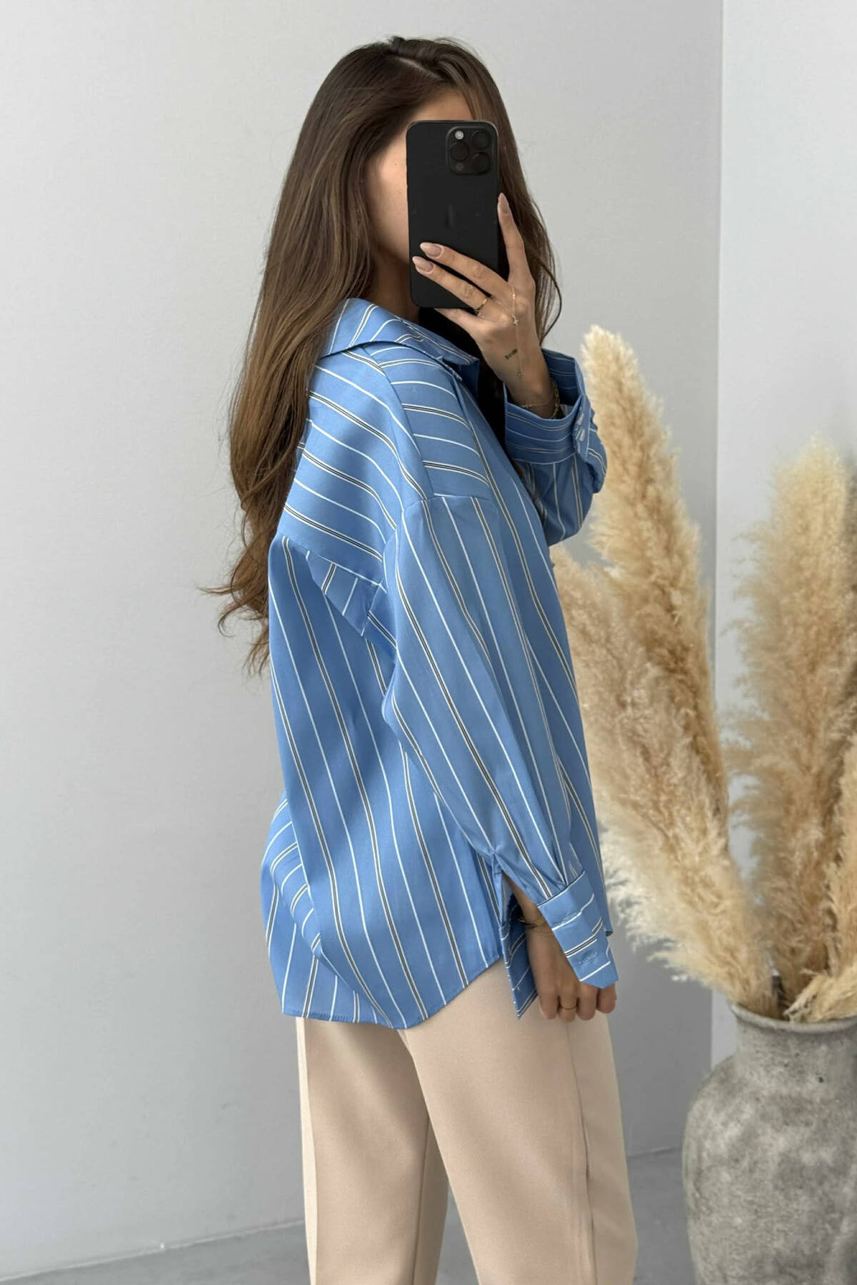 SIMPLE STRIPE DESIGN LONE SLEEVE WOMEN SHIRT LIGHTBLUE/BZ