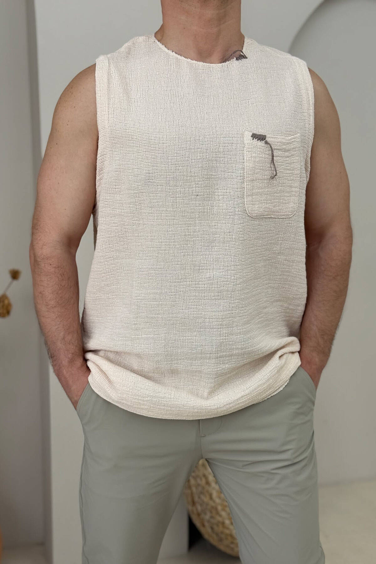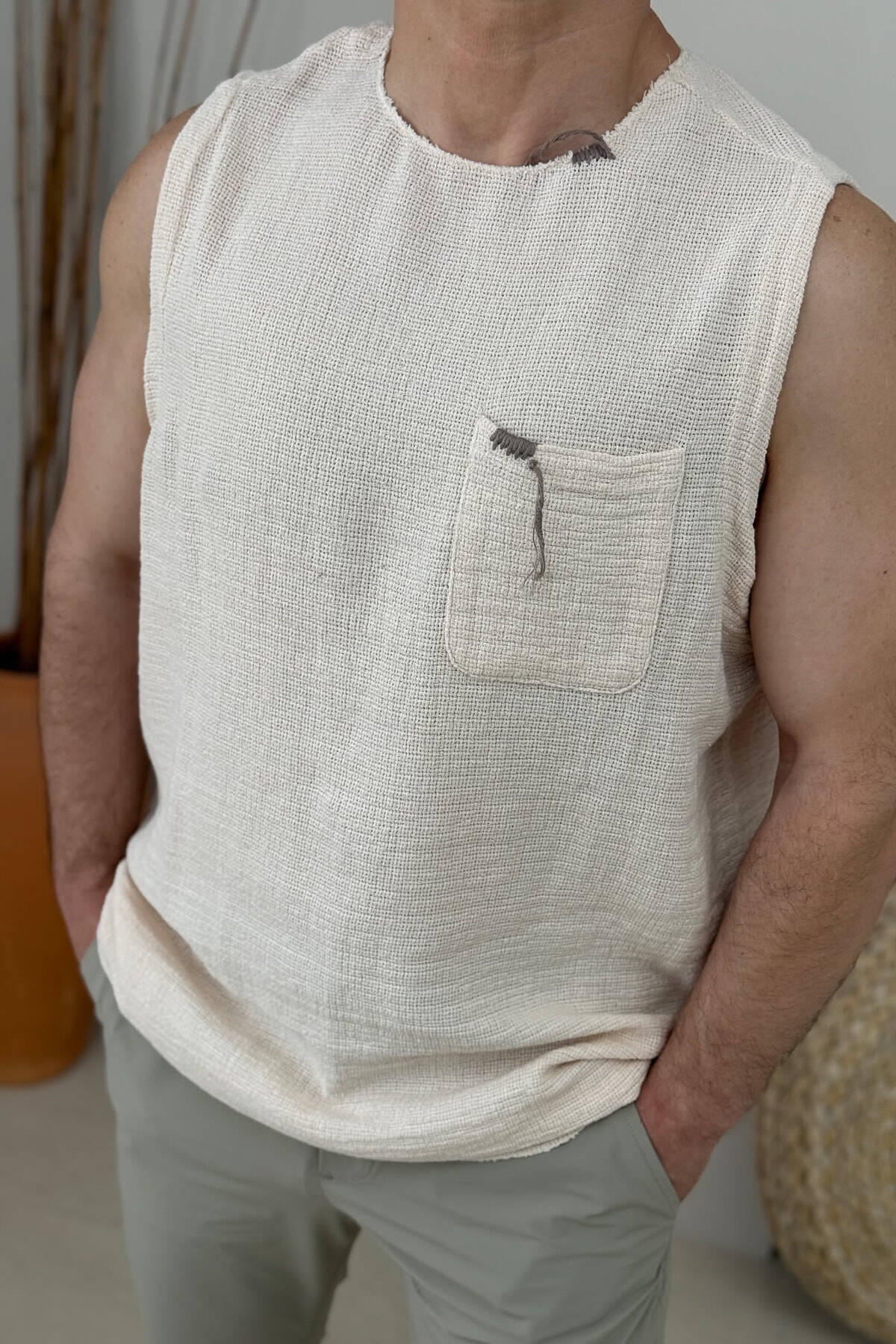 ONE COLOR POCKET DETAIL MEN TANK TOP BEIGE/BEZHE