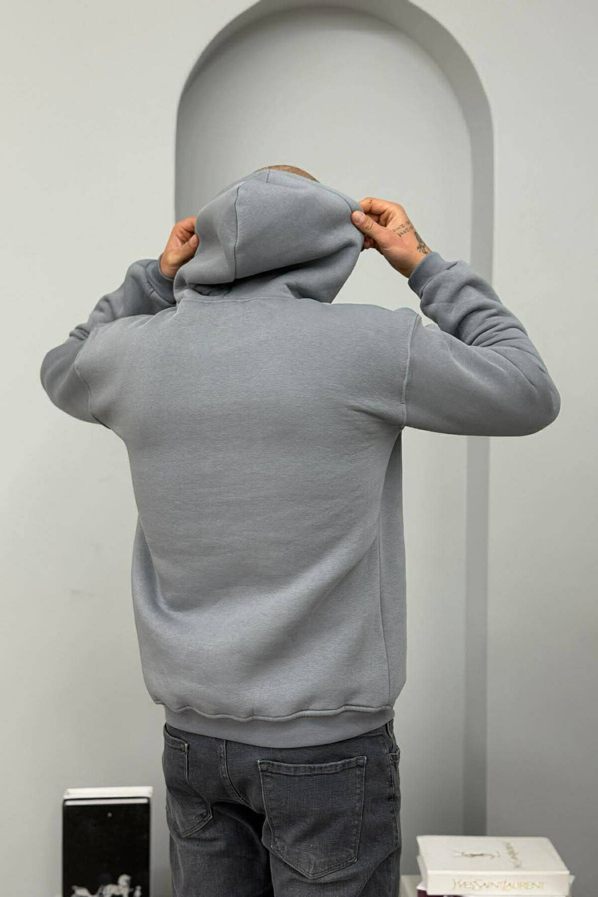 SMALL DETAIL ONE COLOR FLUFFY MEN HOODIE GREY/GRI