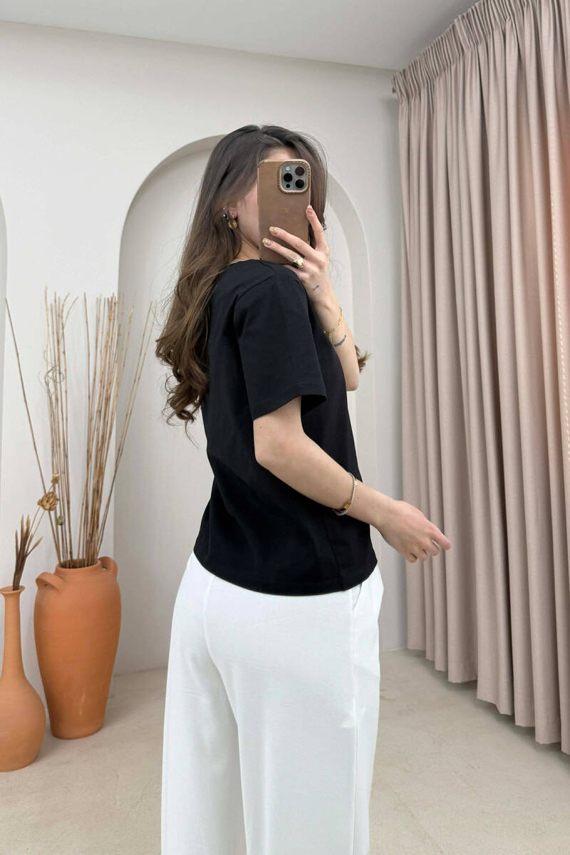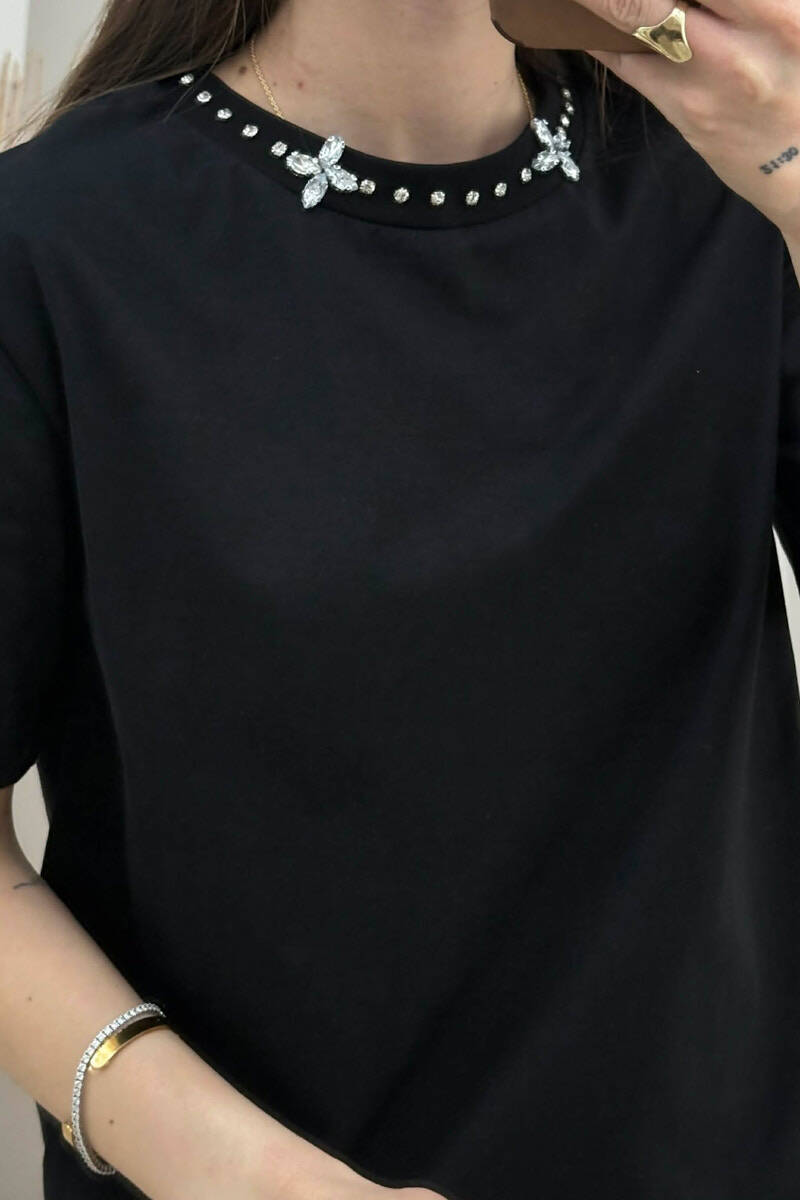 T-SHIRT ME DETAJE TEK PJESA E QAFES PER FEMRA NE NGJYRE TE ZEZE