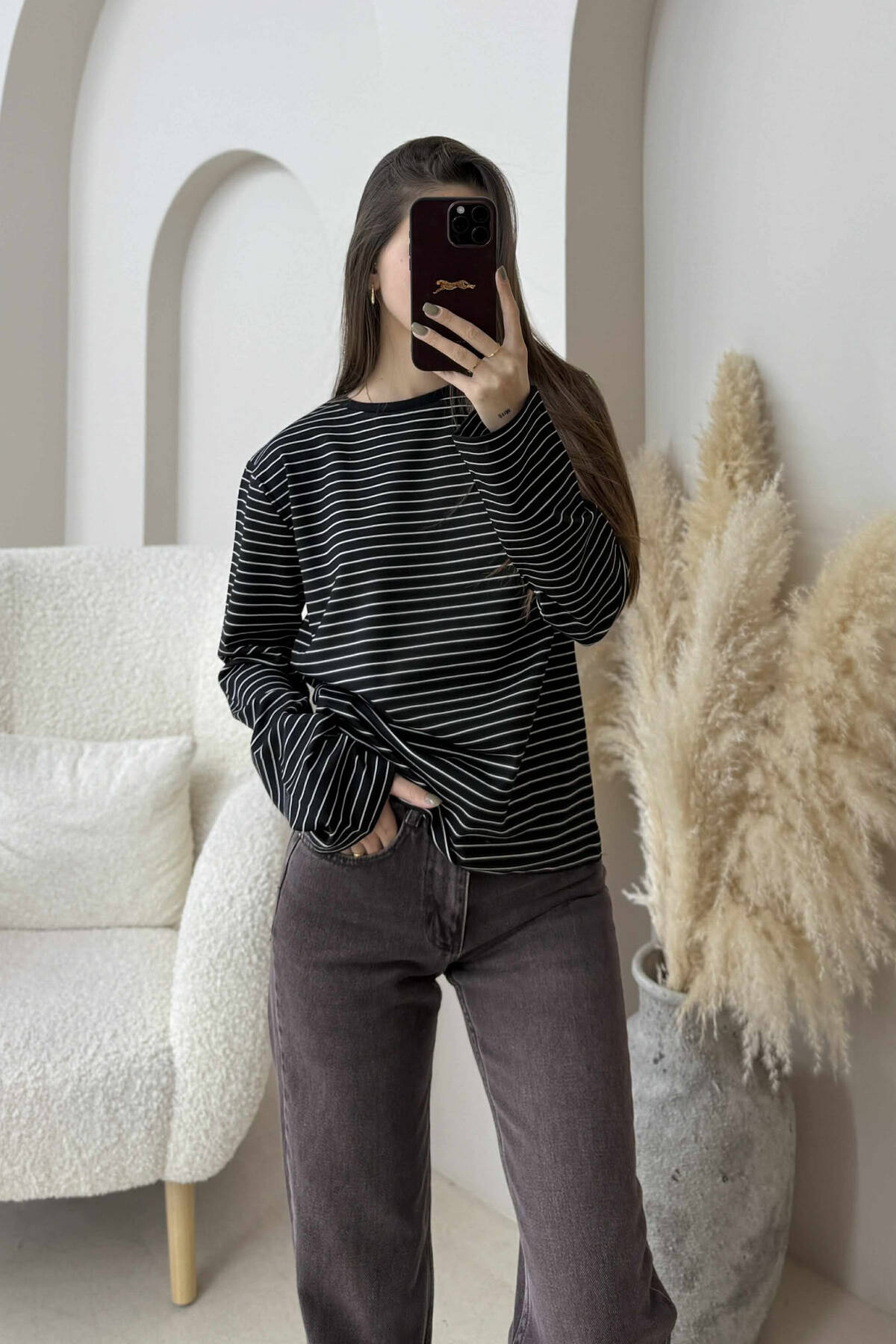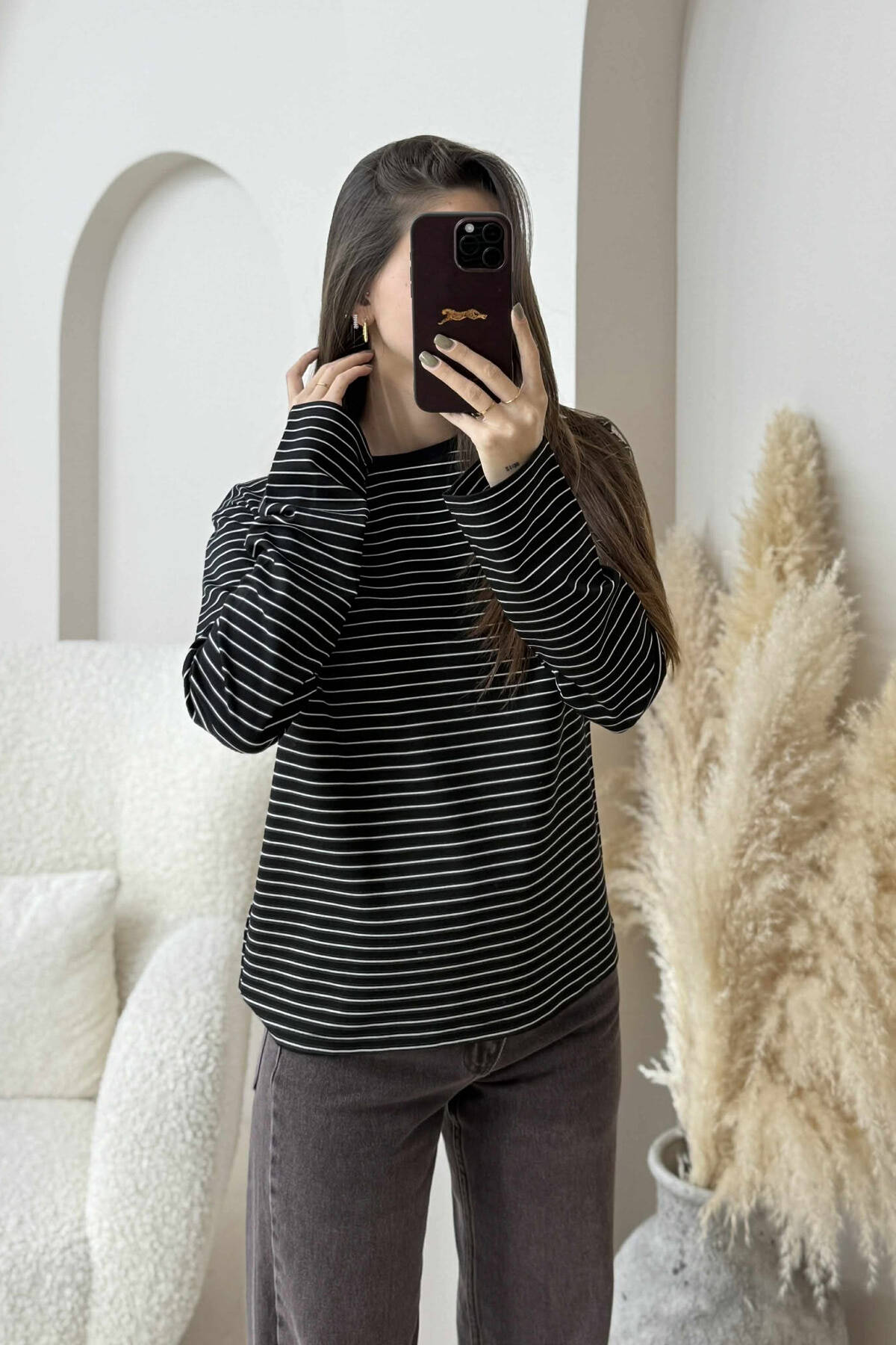 STRIPE DESIGN ROUND NECK WOMEN SWEATSHIRT BLACK/ E ZEZE