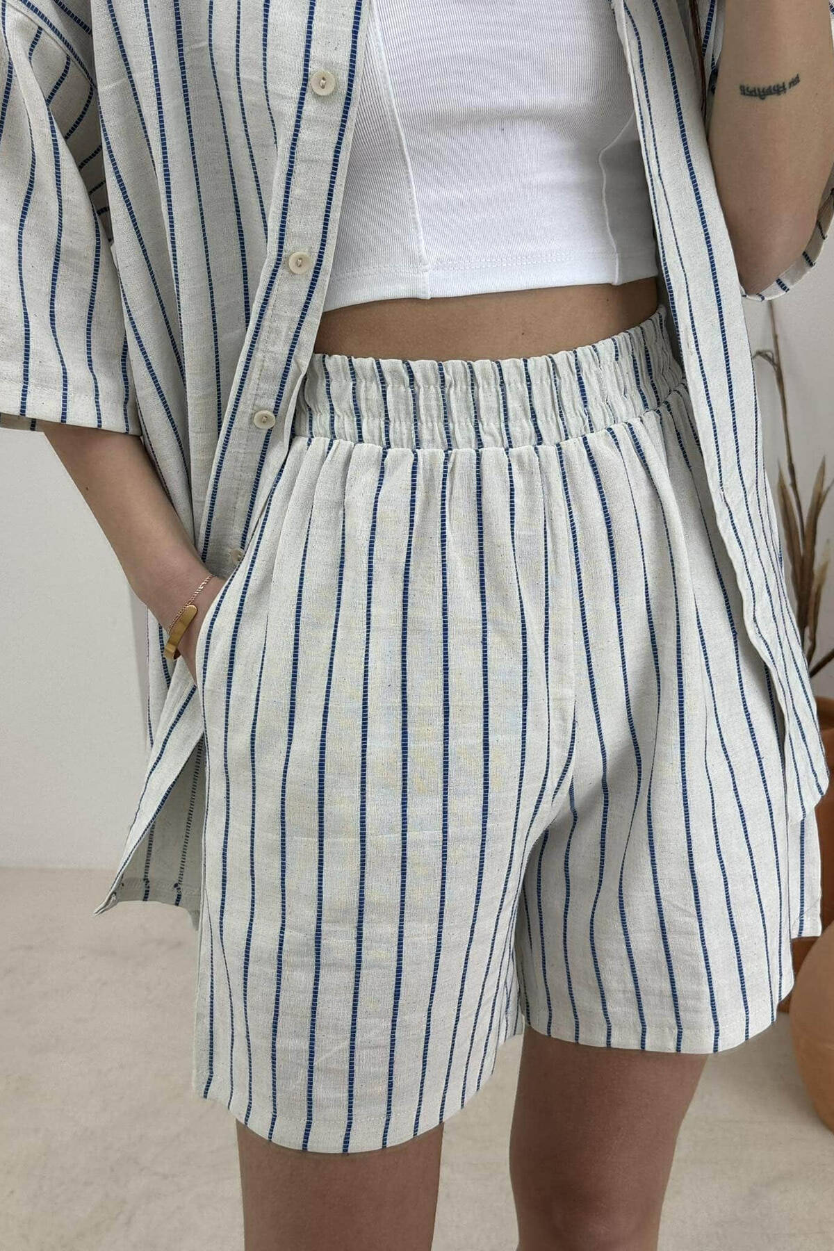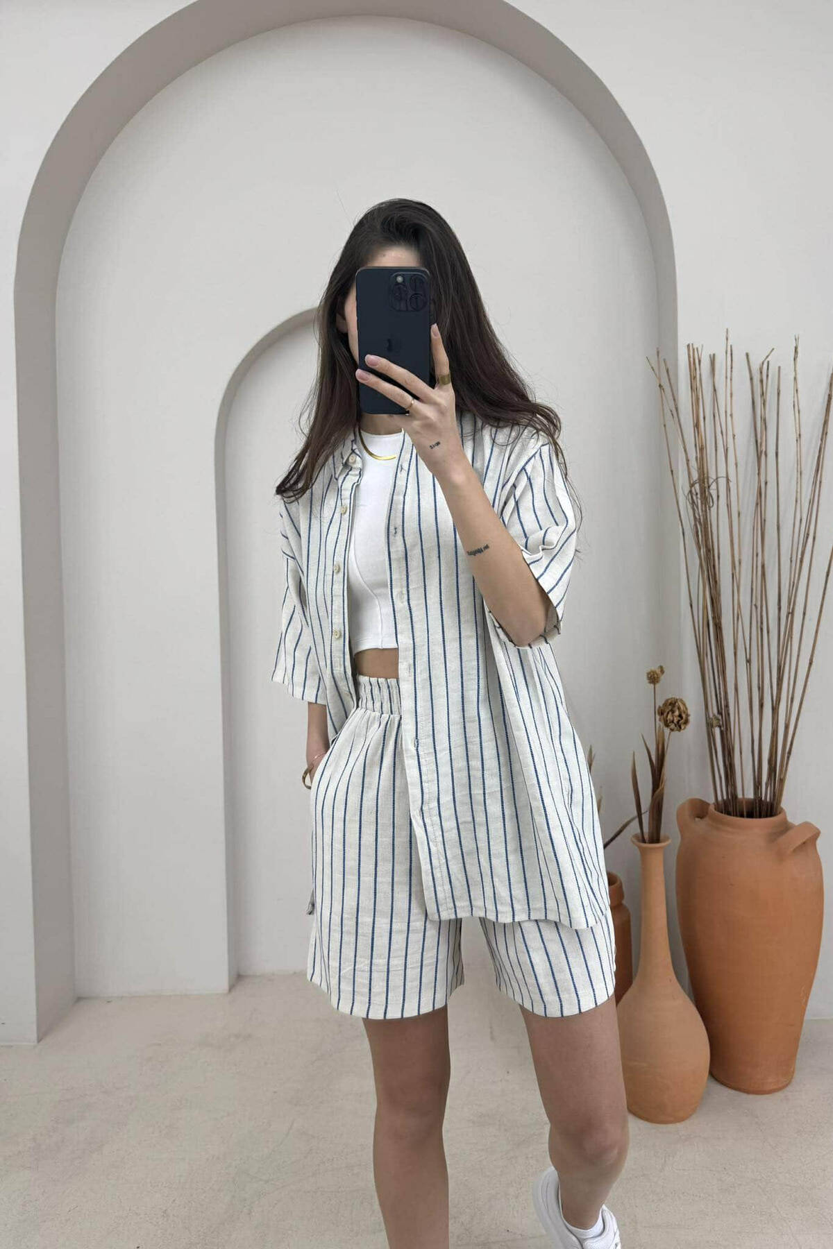 STRIPE DESIGN SHIRT+SHORTS WOMEN SET CREAM-BLUE/KREM-BLU