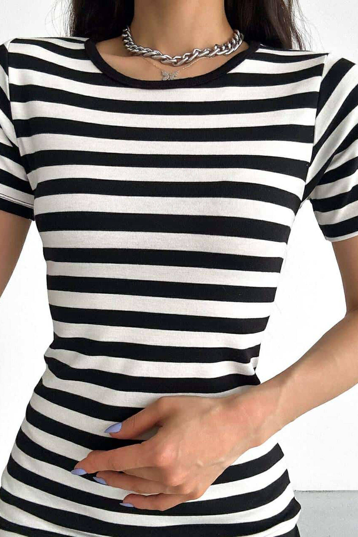 STRIPE DESIGN SIMPLE WOMEN DRESS WHITE-BLACK/BAZE