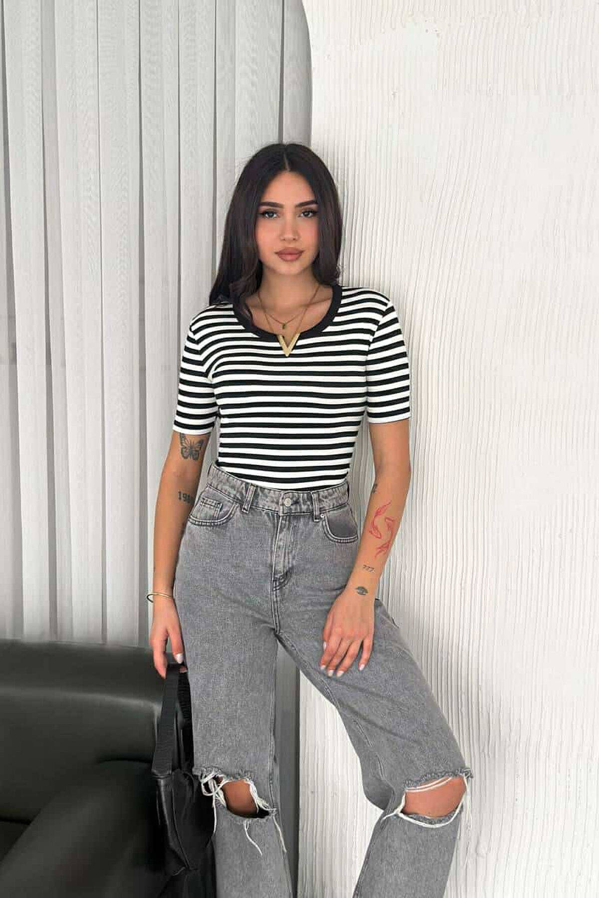 STRIPE DESIGN V GOLD DETAIL WOMEN T-SHIRT WHITE-BLACK/BAZE