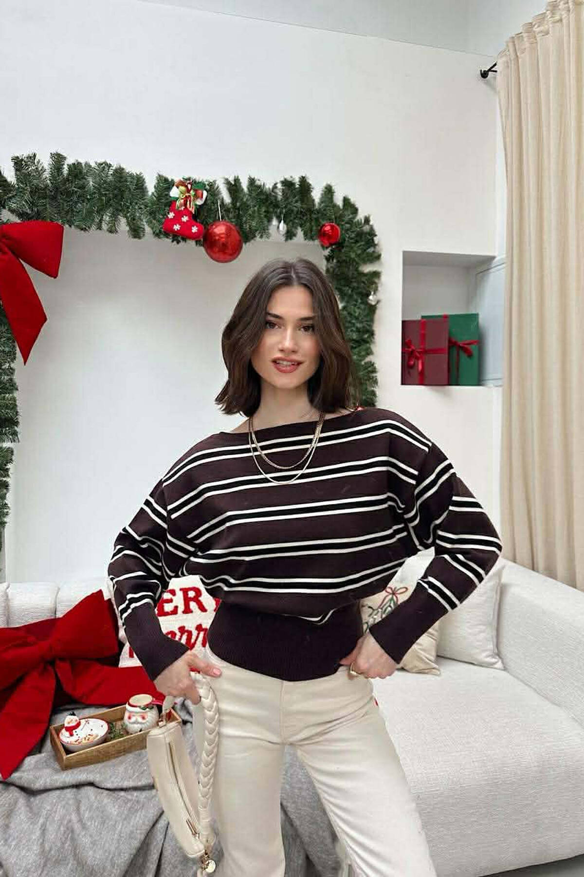 STRIPE DESIGN WOMEN SWEATER BROWN/KAFE