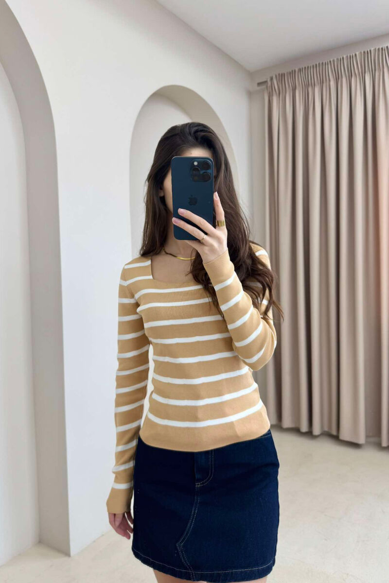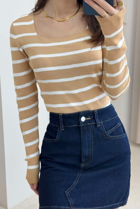 STRIPE SQUARE NECK WOMEN SWEATER BEIGE/BEZHE