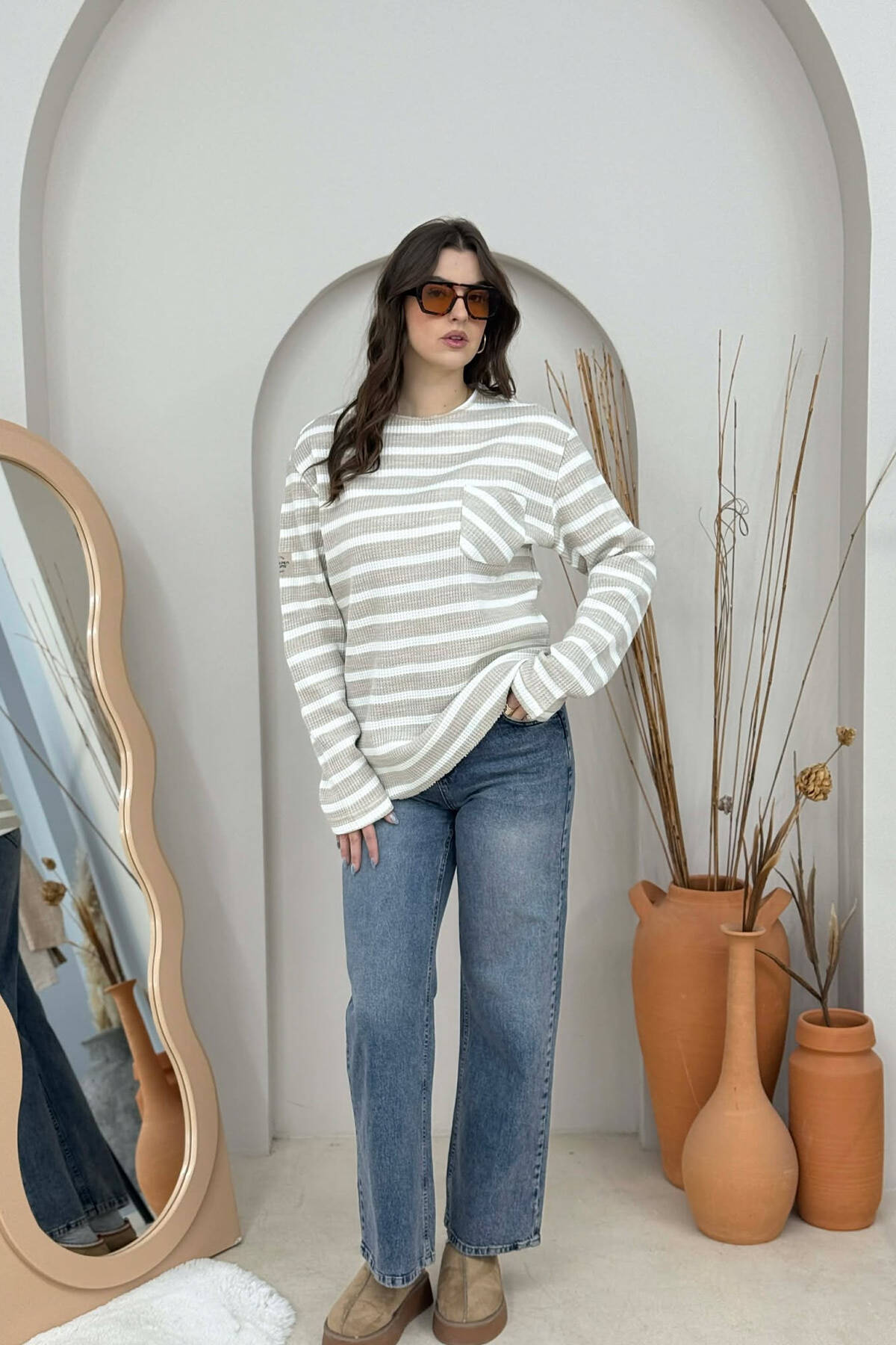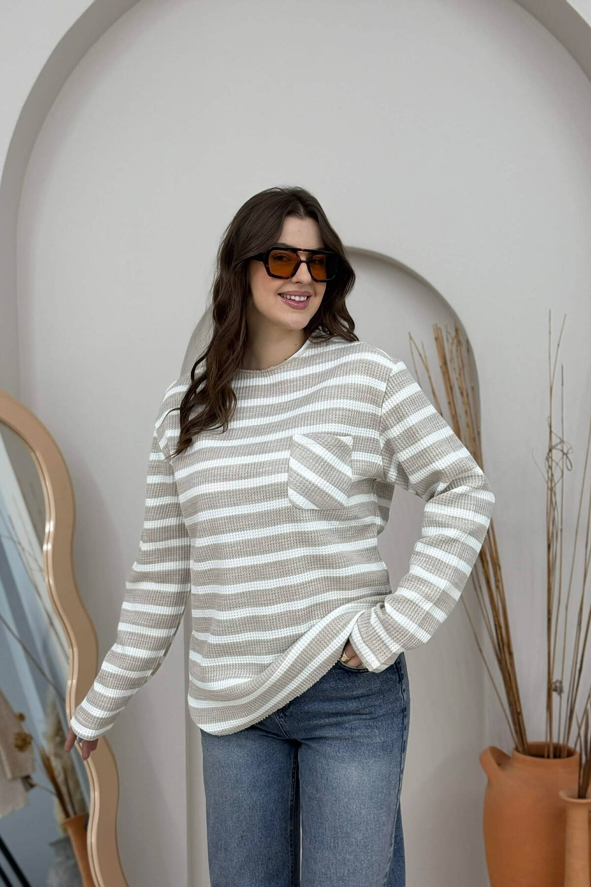 STRIPED DESIGN POCKET DETAIL WOMEN SWEATER BEIGE/BEZHE