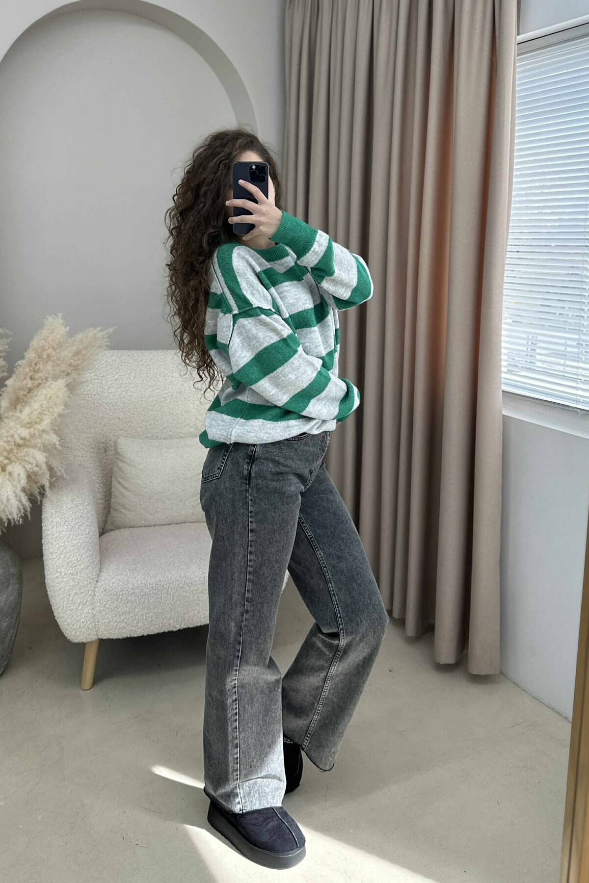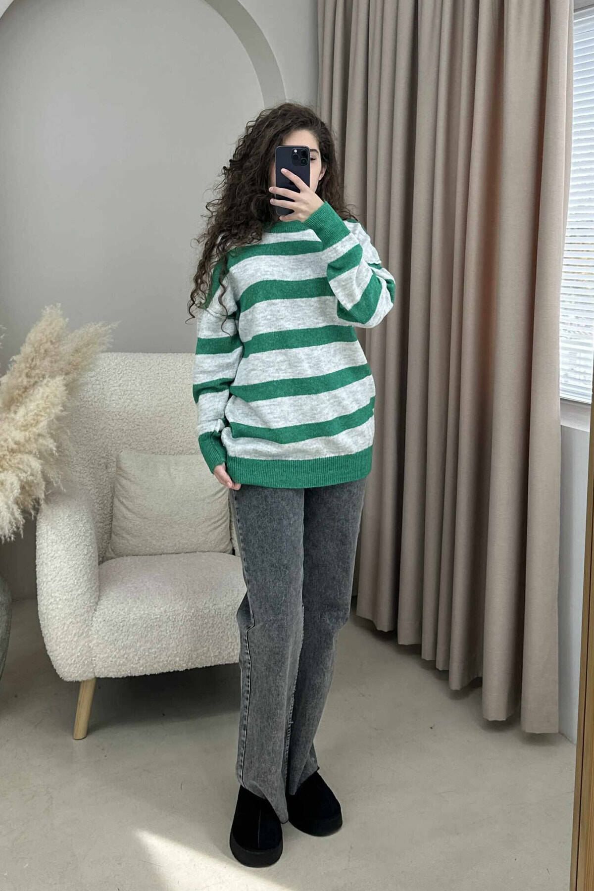 STRIPED SIMPLE WOMEN SWEATER GREY-GREEN/GRI-JESHILE