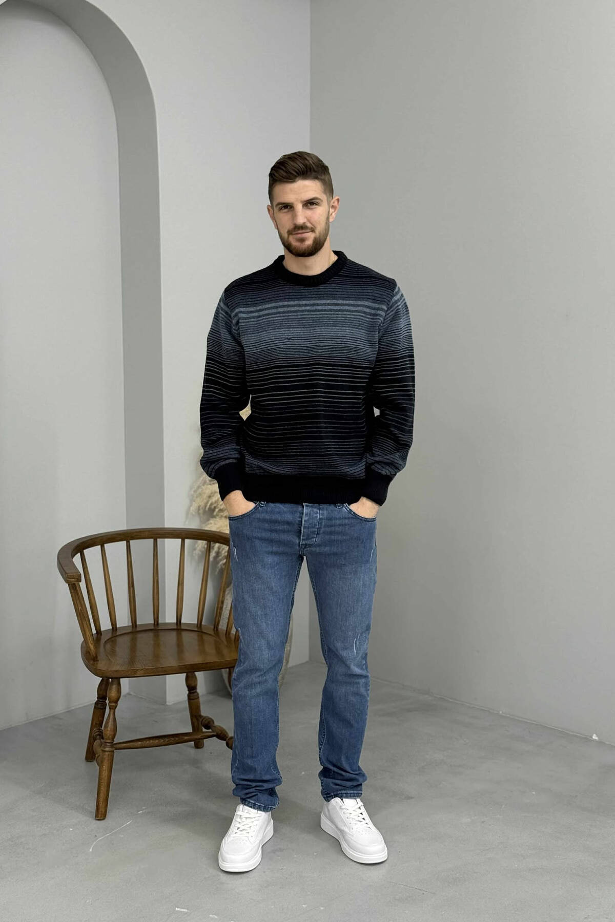 STRIPES DESIGN ROUND NECK KNITTED MEN SWEATER DARK BLUE/BEE
