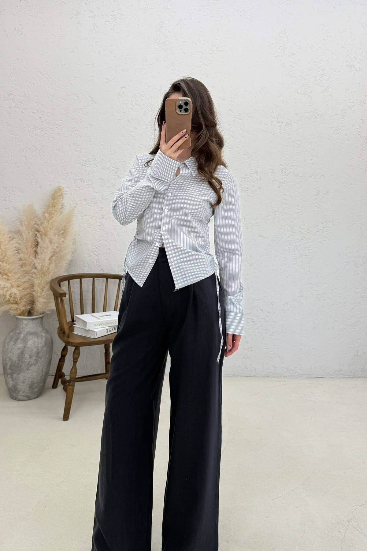 STRIPE DESIGN LACING DETAIL WOMAN SHIRT GREY/GRI