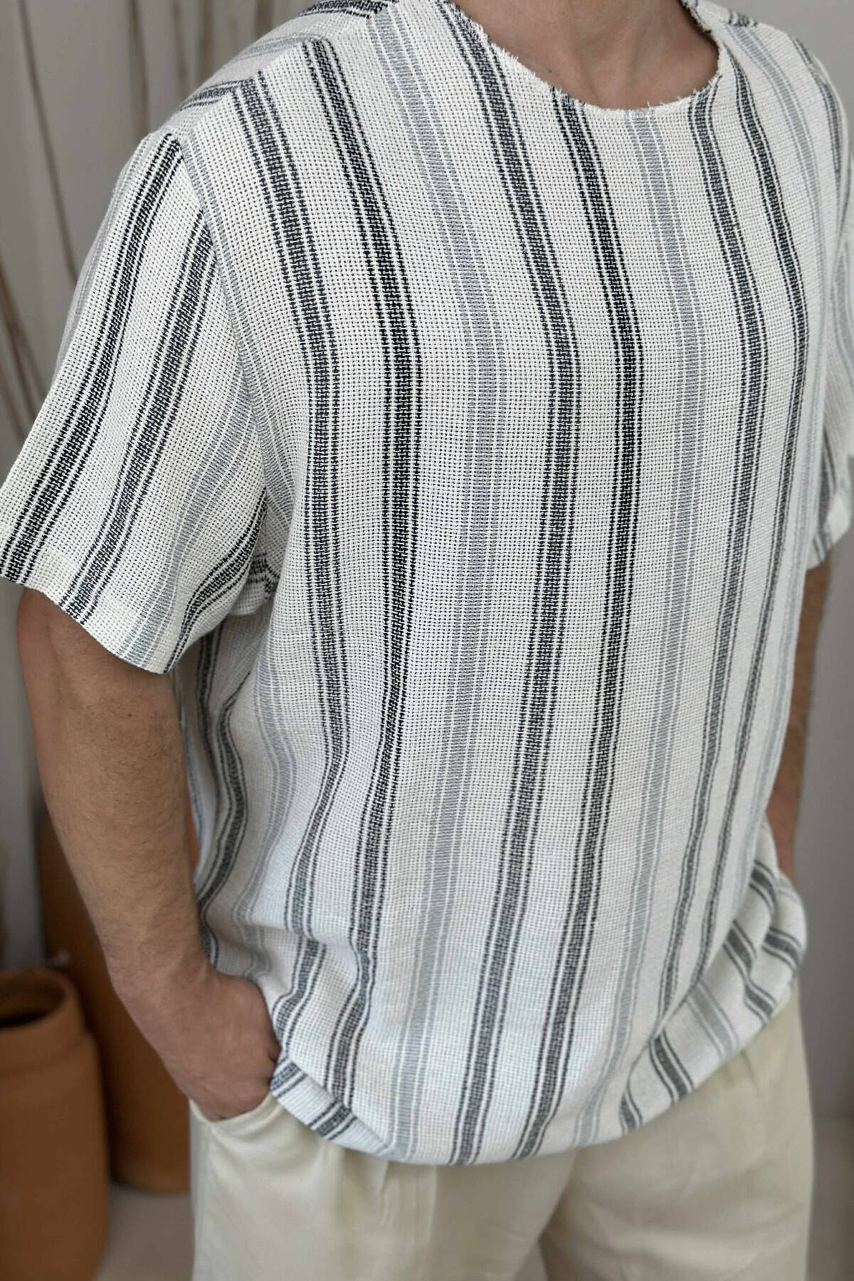 T-SHIRT I THJESHTË ME DIZAJNIN E VIJAVE PËR MESHKUJ NË NGJYRËN KREM+E ZEZË