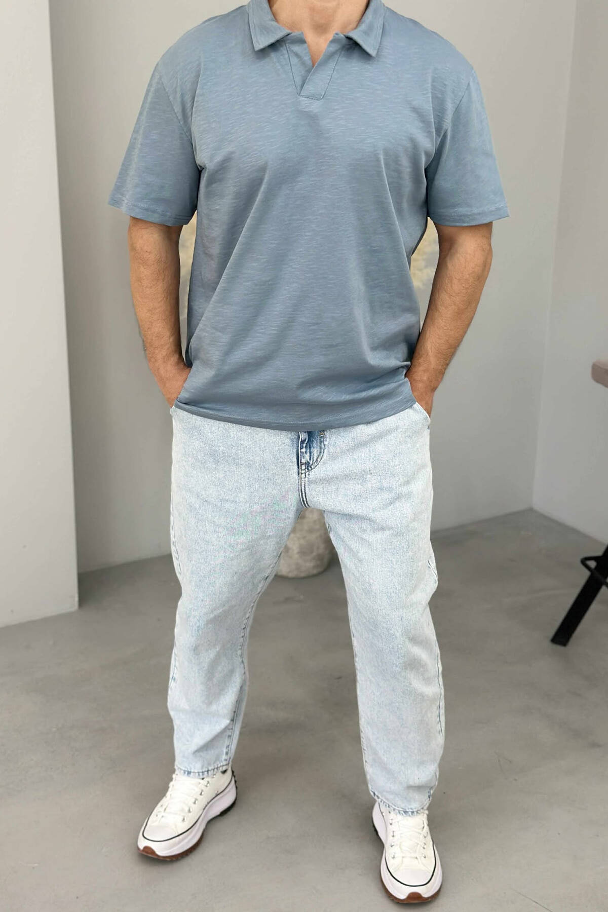 T-SHIRT I THJESHTË ME JAKË POLO PËR MESHKUJ NË NGJYRËN BLU E ZBARDHUR