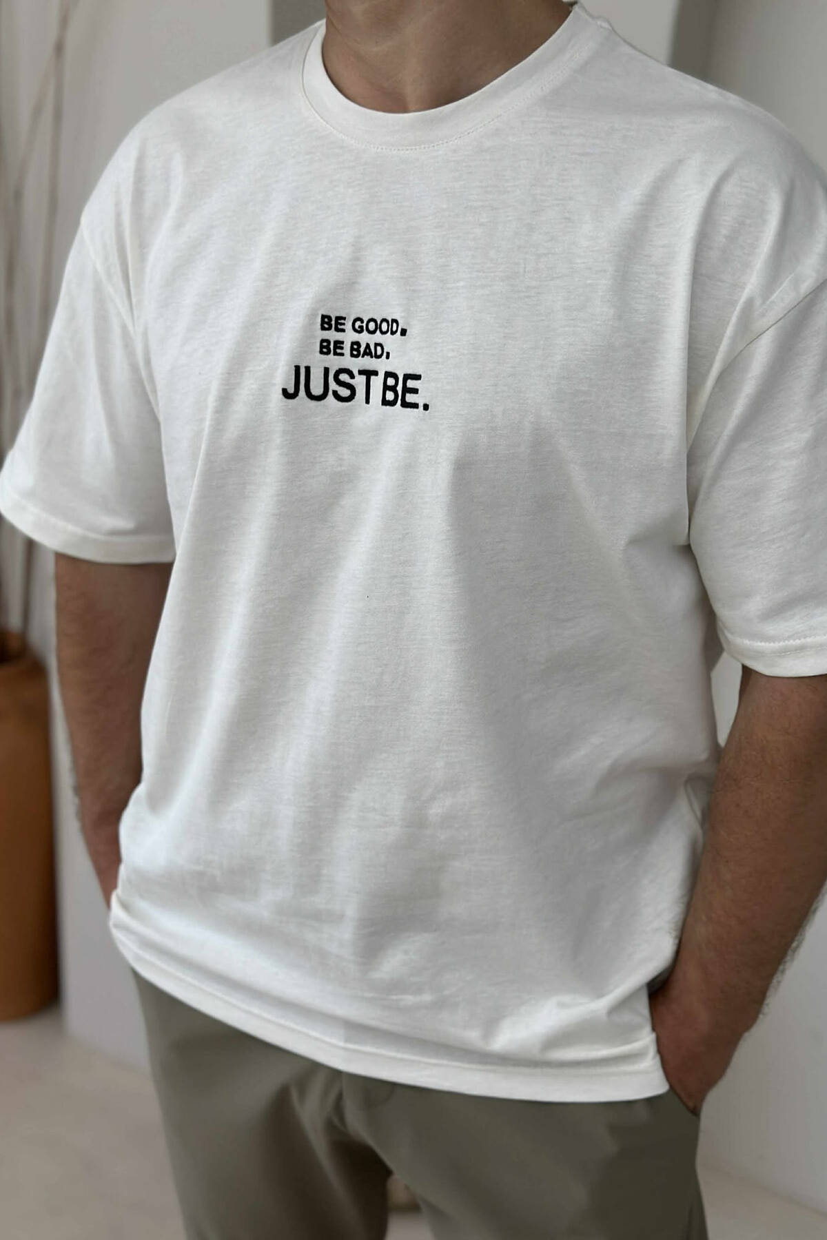 T-SHIRT I THJESHTË ME SHKRIME PËR MESHKUJ NË NGJYRËN KREM