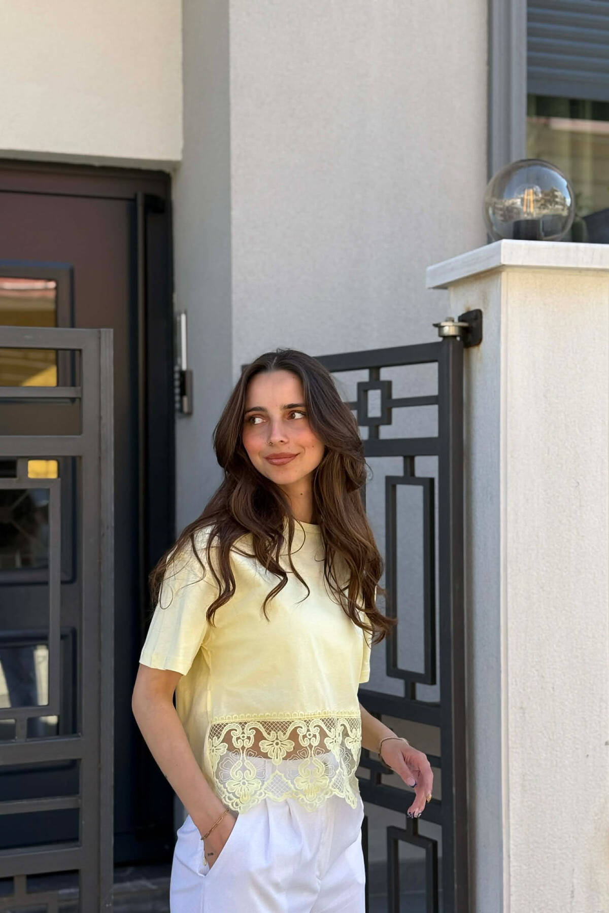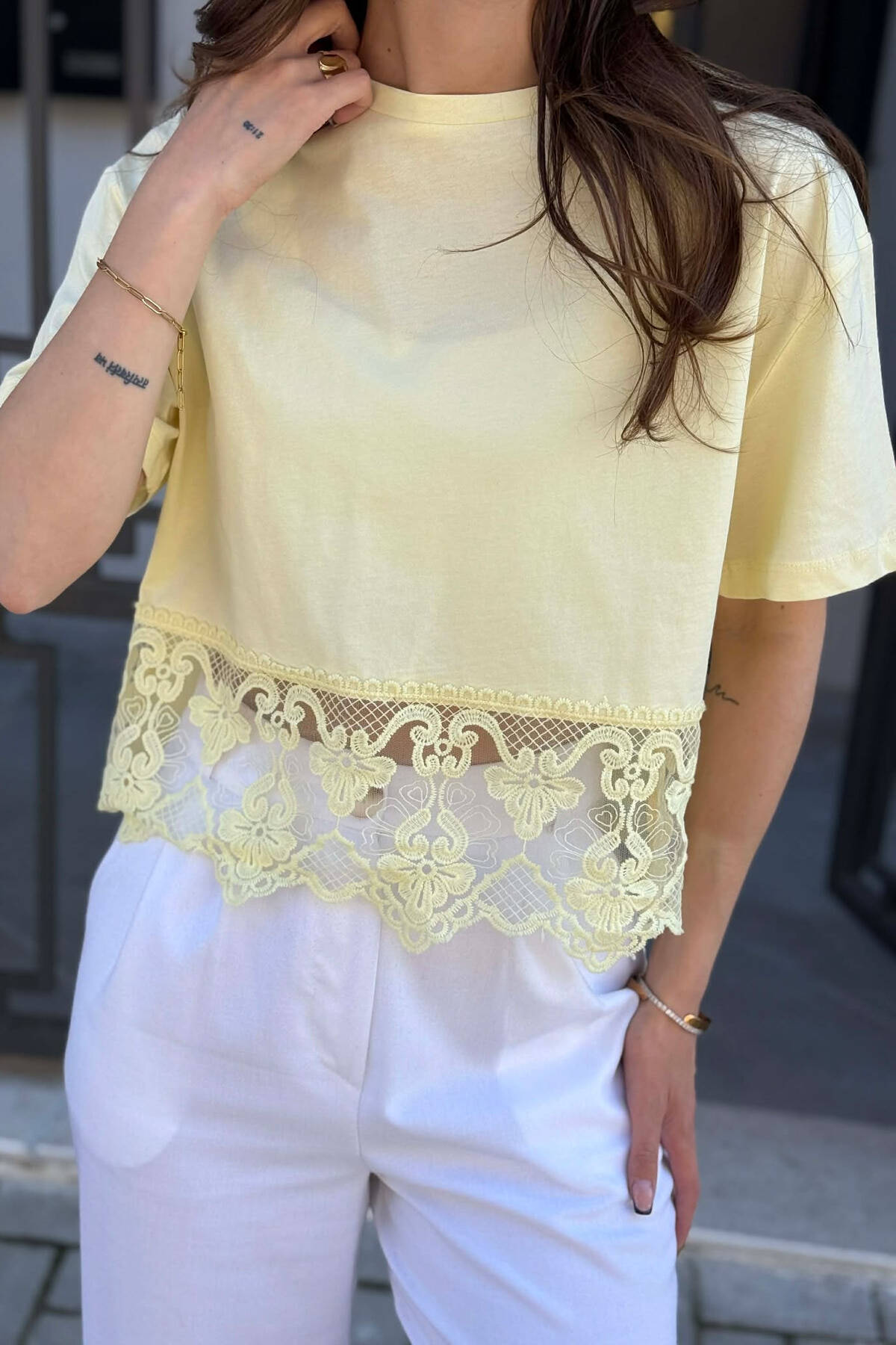 T-SHIRT ME DETAJ DANTELLE PER FEMRA NE NGJYRE TE VERDHE