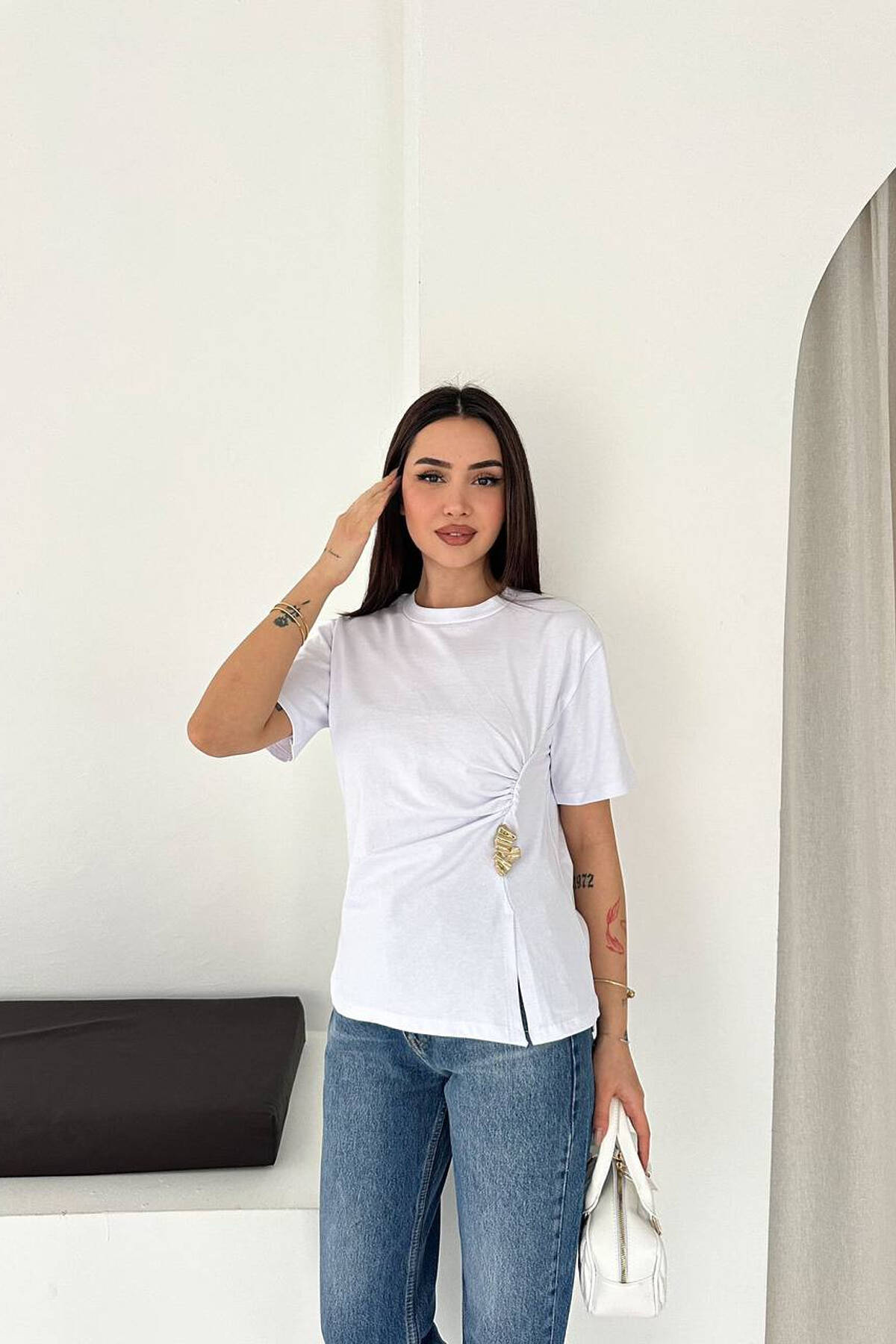 T-SHIRT ME DETAJ GOLD PER FEMRA NE NGJYRE TE BARDHE
