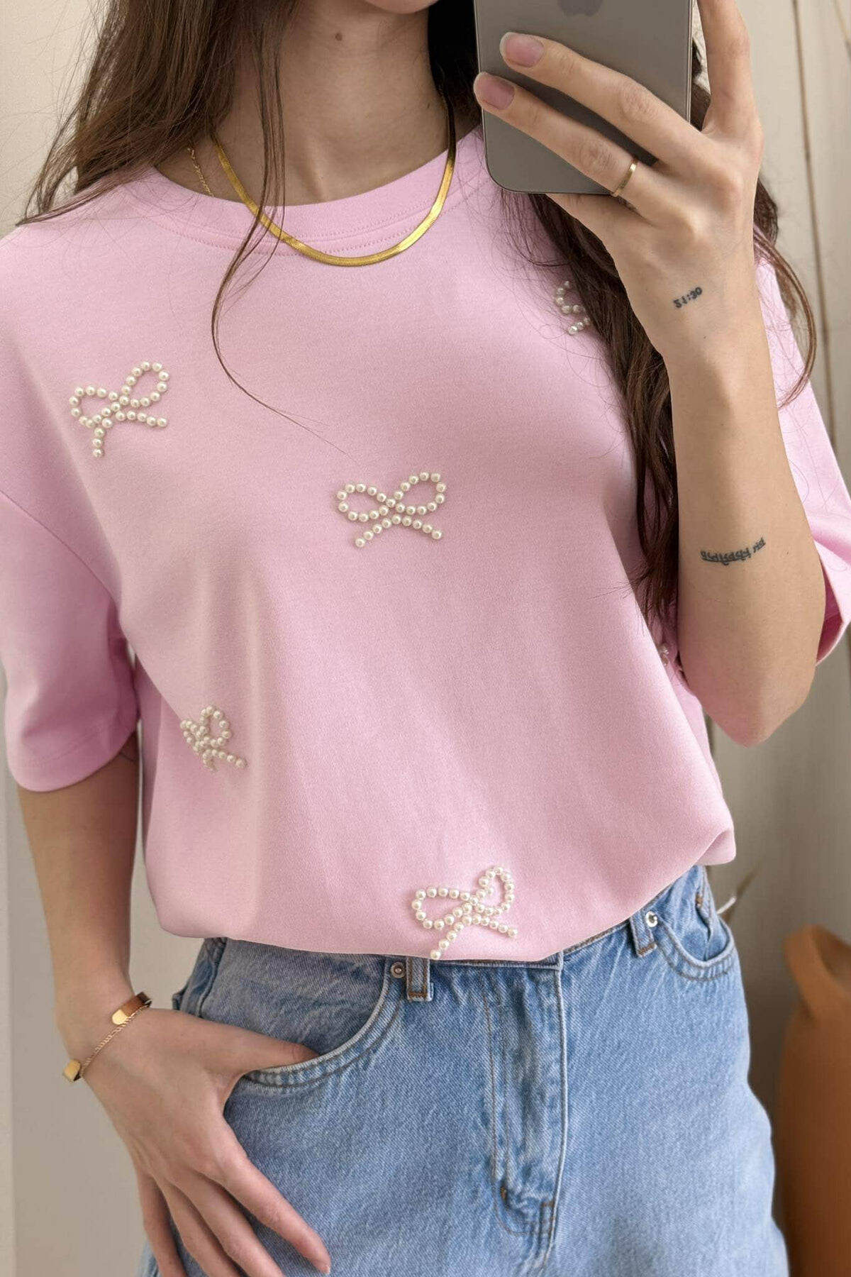 T-SHIRT ME DETAJIN E FJONGOVE ME PERLA PËR FEMRA NË NGJYRËN ROZË