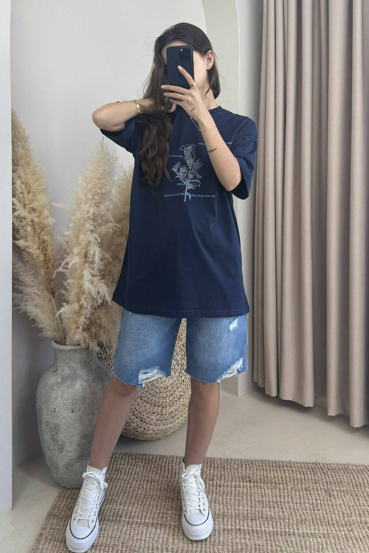 T-SHIRT ME DIZANJ DHE SHKRIME PËR FEMRA NË NGJYRËN BLU TË ERRËT