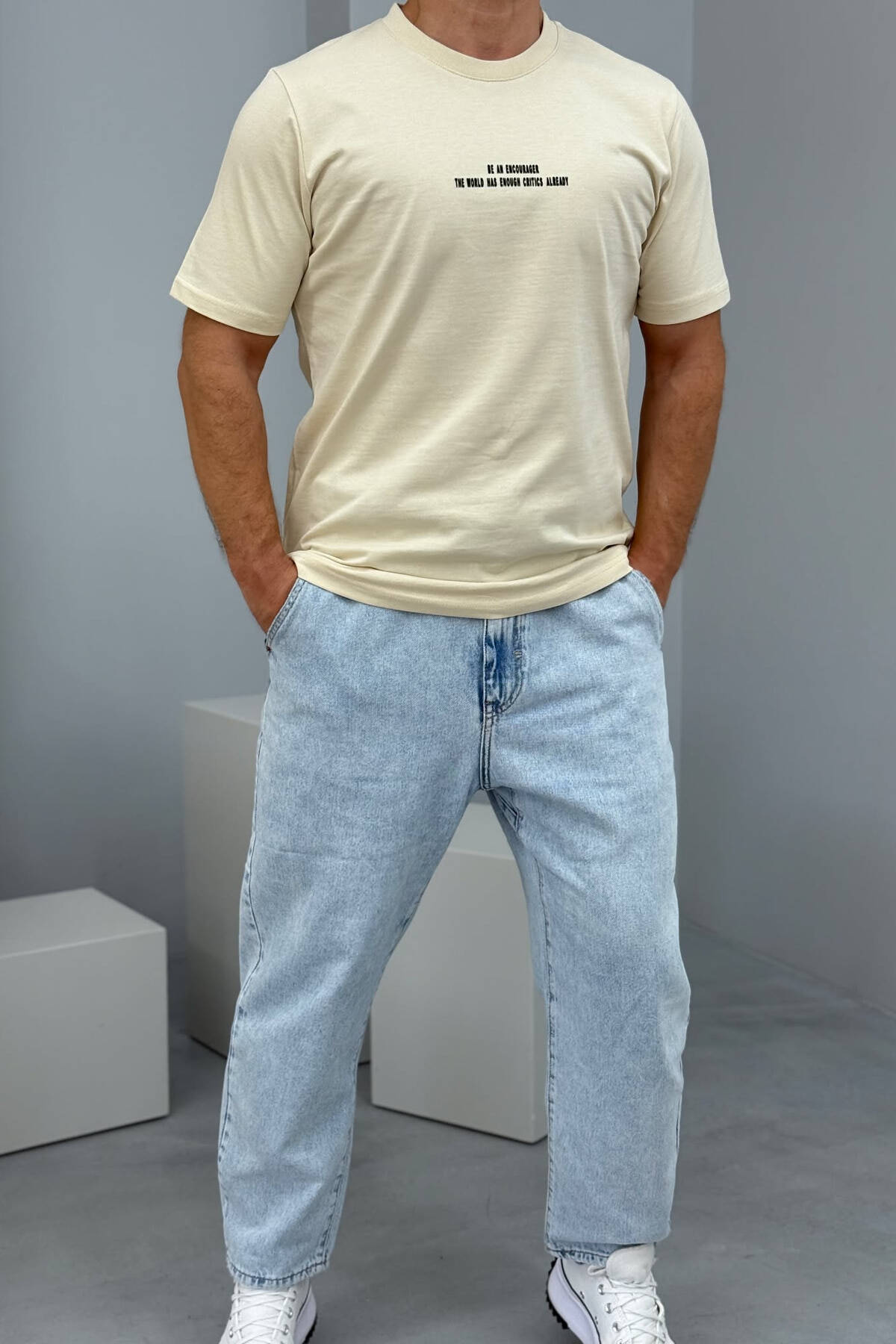 T-SHIRT ME SHKRIME PËR MESHKUJ NË NGJYRËN BEZHË E ZBARDHUR