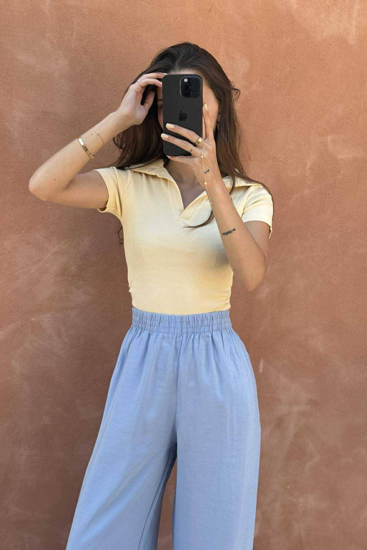 T-SHIRT NJË NGJYRËSH I THJESHTË ME JAKË POLO PËR FEMRA NË NGJYRËN E VERDHË