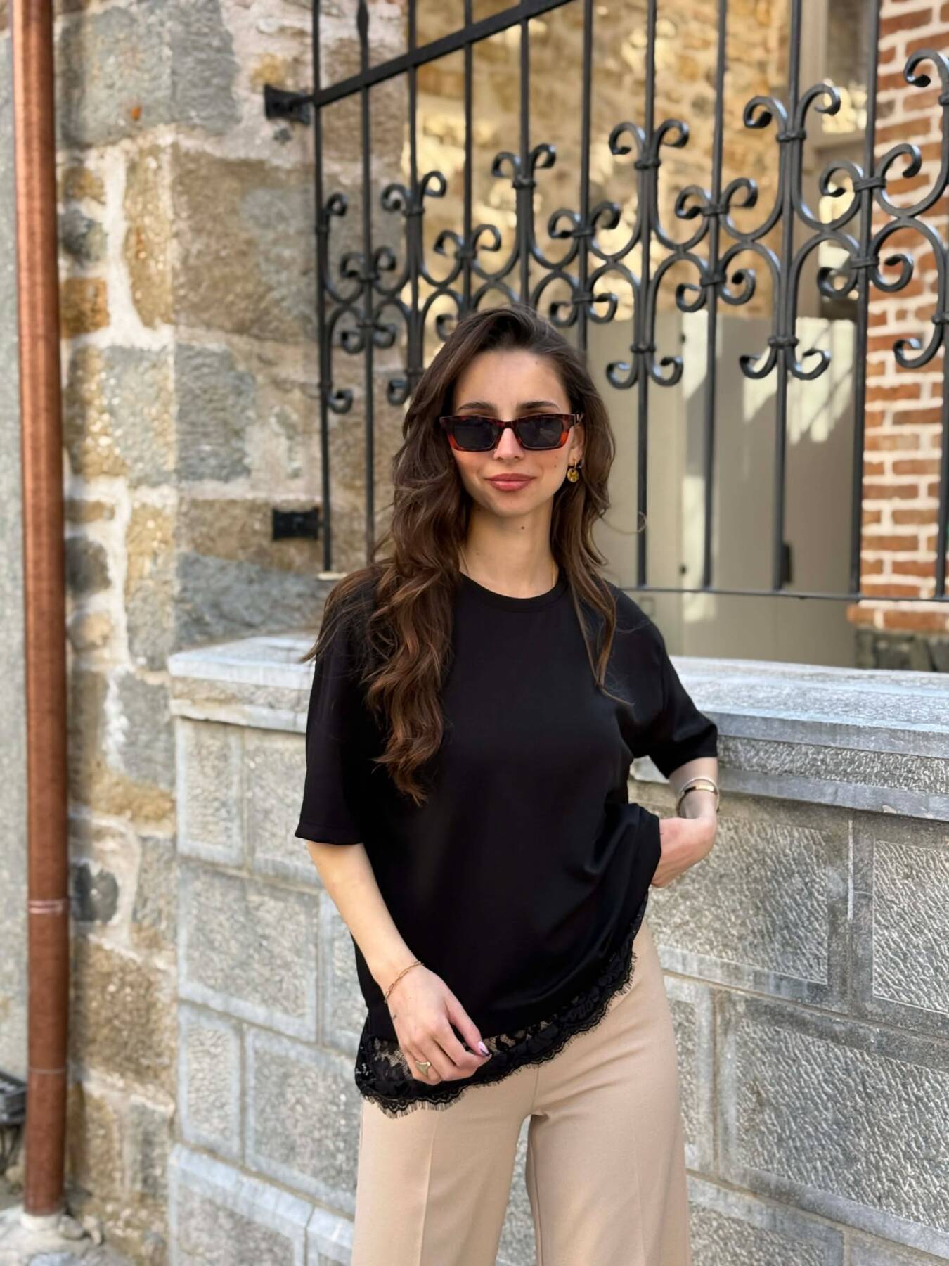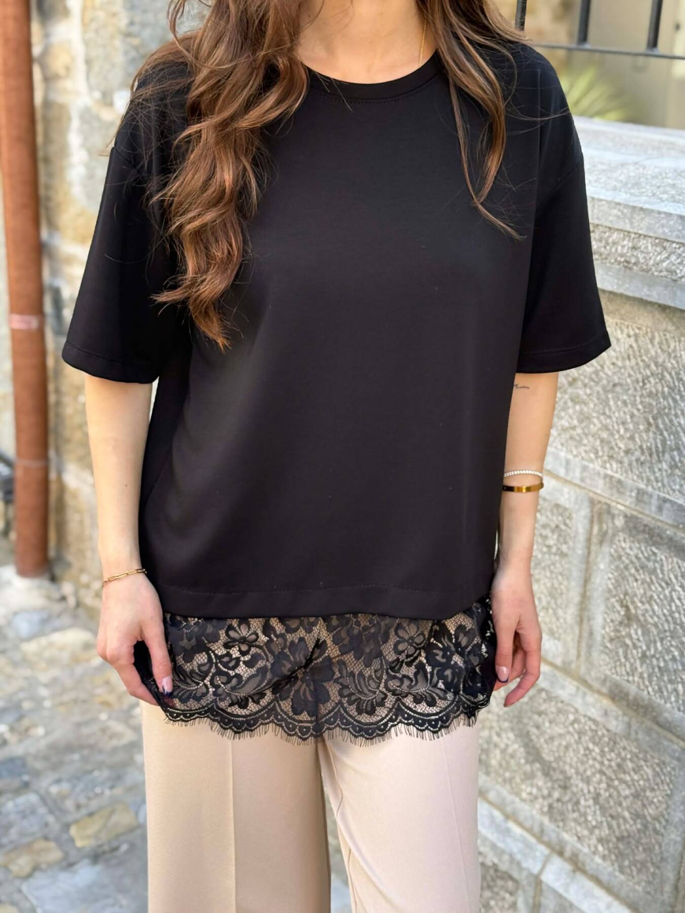 T-SHIRT NJE NGJYRESH ME DETAJ DANTELLE PER FEMRA NE NGJYRE TE ZEZE