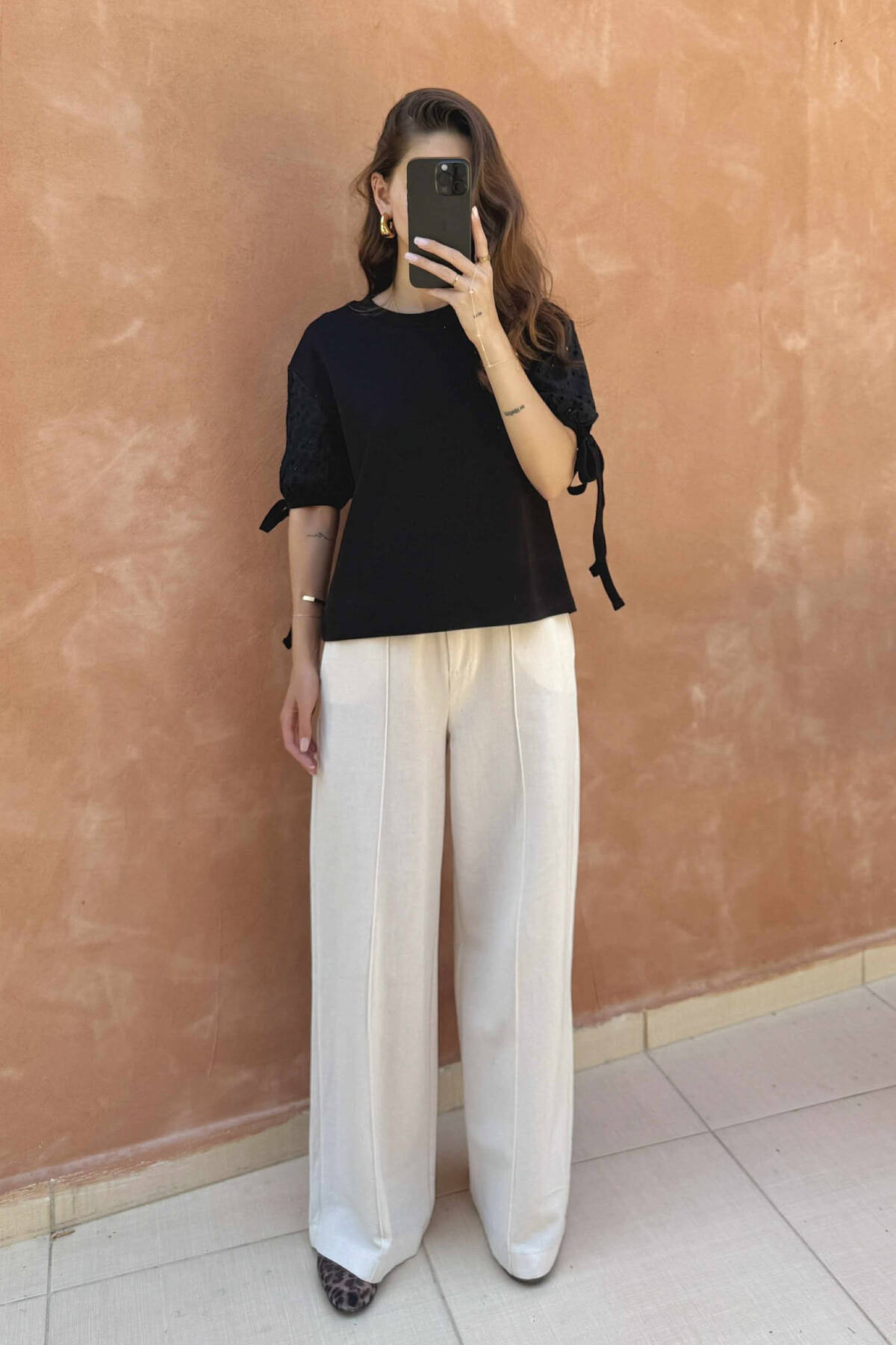 T-SHIRT NJË NGJYRËSH ME DETAJIN E LIDHSES PËR FEMRA NË NGJYRËN E ZEZË