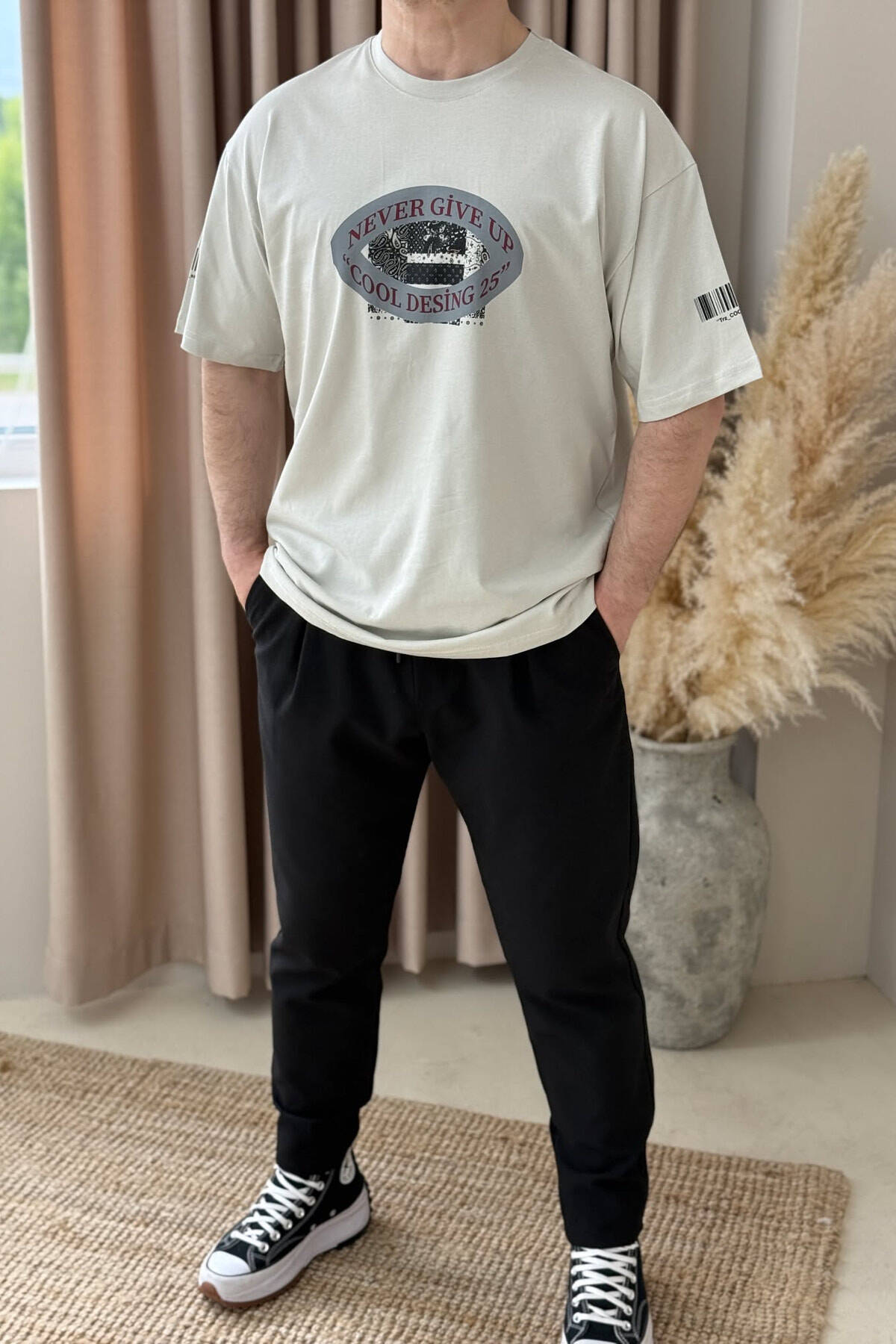 T-SHIRT NJË NGJYRËSH ME DIZAJN PËR MESHKUJ NË NGJYRËN BEZHË E ZBARDHUR