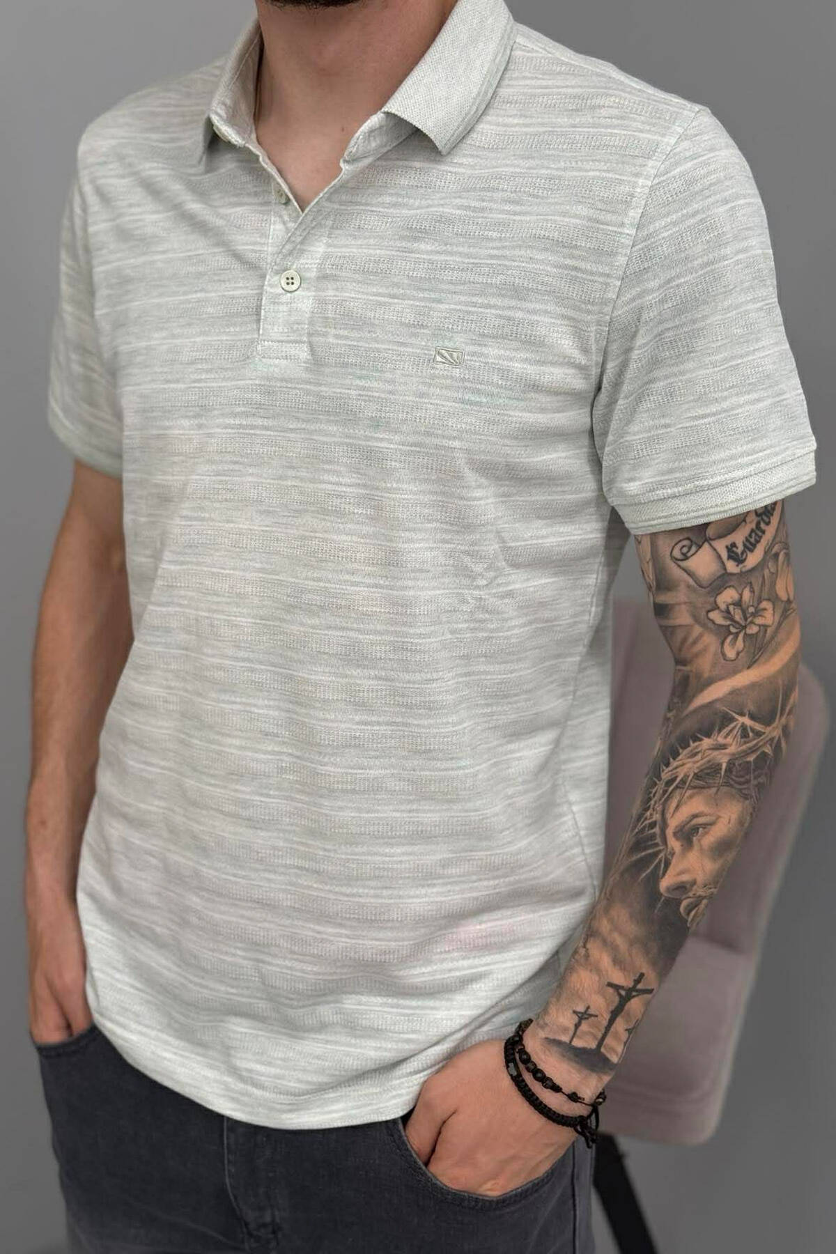 STRIPED DESIGN POLO NECK MEN T-SHIRT GREEN/JESHILE