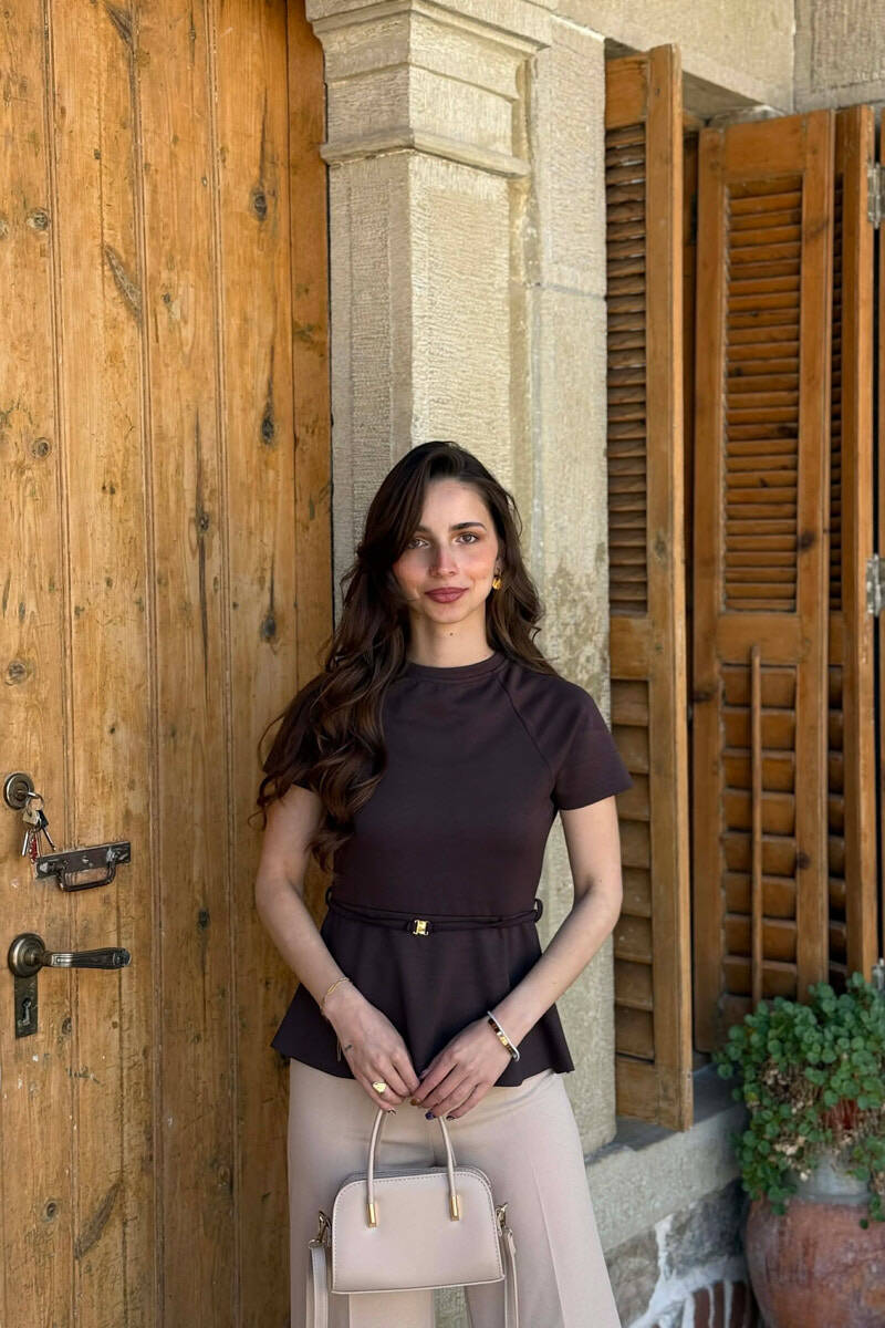 T-SHIRT NJE NGJYRESH ME LIDHESE TEK BELI PER FEMRA NE NGJYRE KAFE
