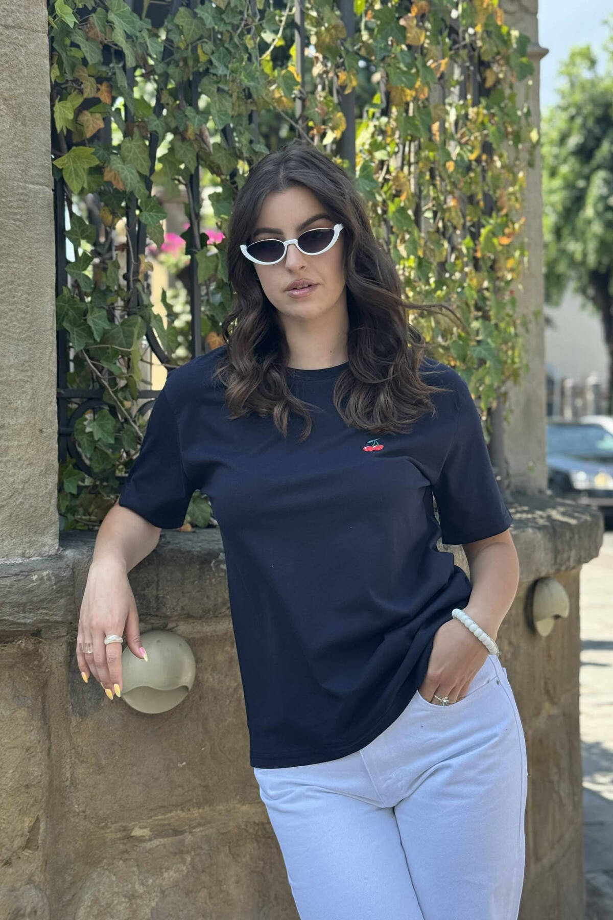 T-SHIRT NJË NGJYRËSH ME LOGON E QERSHISË PËR FEMRA NË NGJYRËN BLU E ERRËT