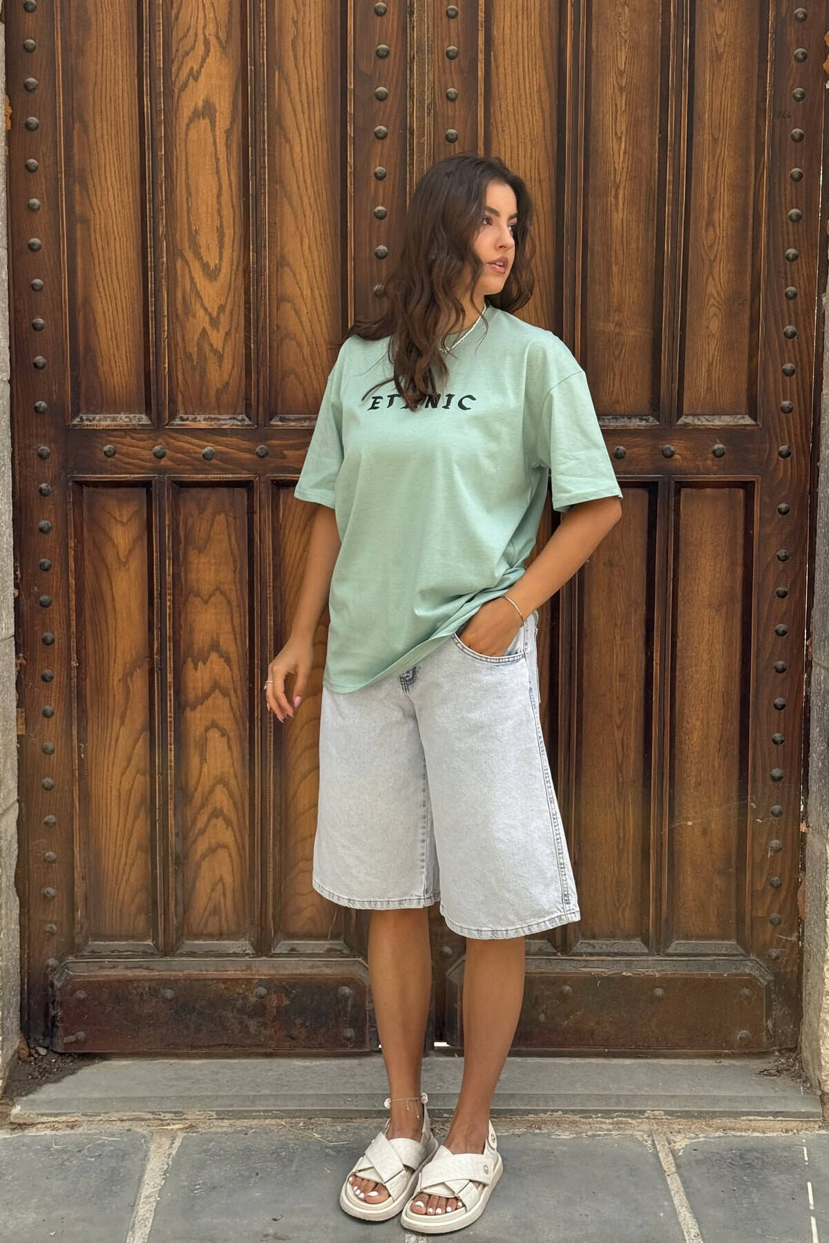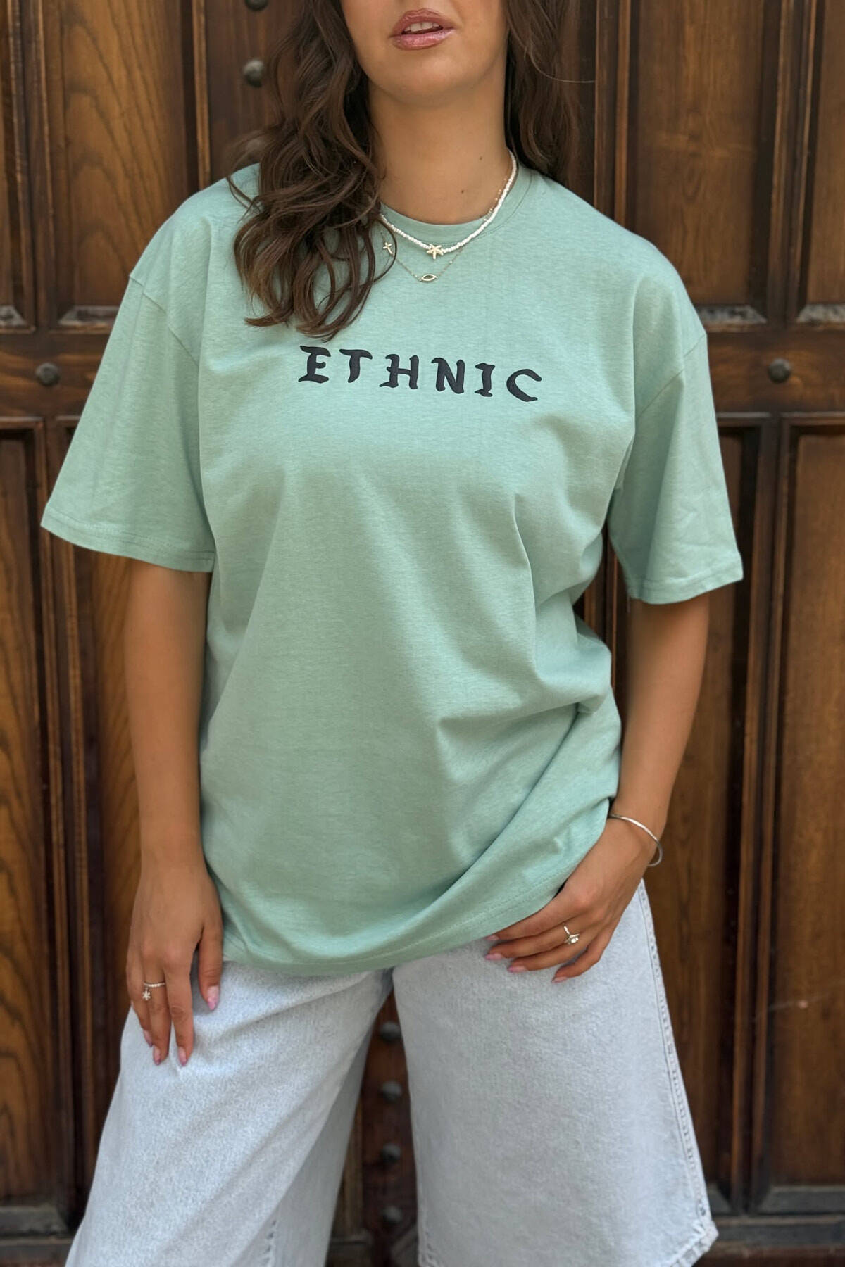 T-SHIRT NJË NGJYRËSH ME SHKRIME PËR FEMRA NË NGJYRËN MENTE