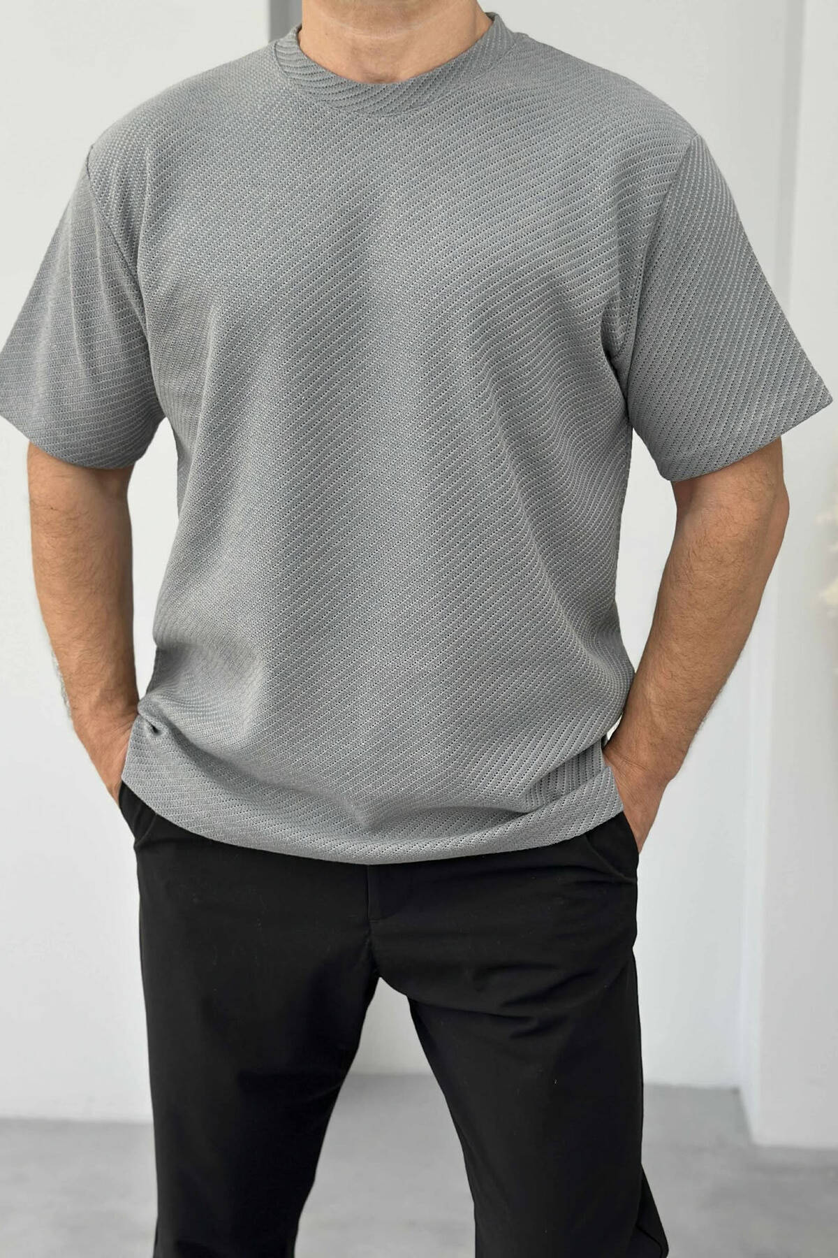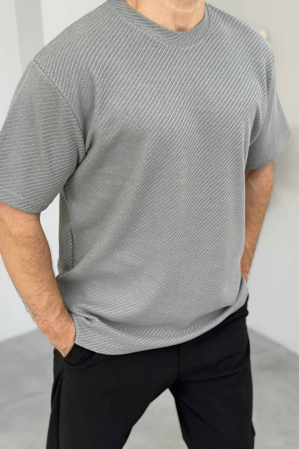 T-SHIRT NJË NGJYRËSH ME TEKSTURË PËR MESHKUJ NË NGJYRËN GRI